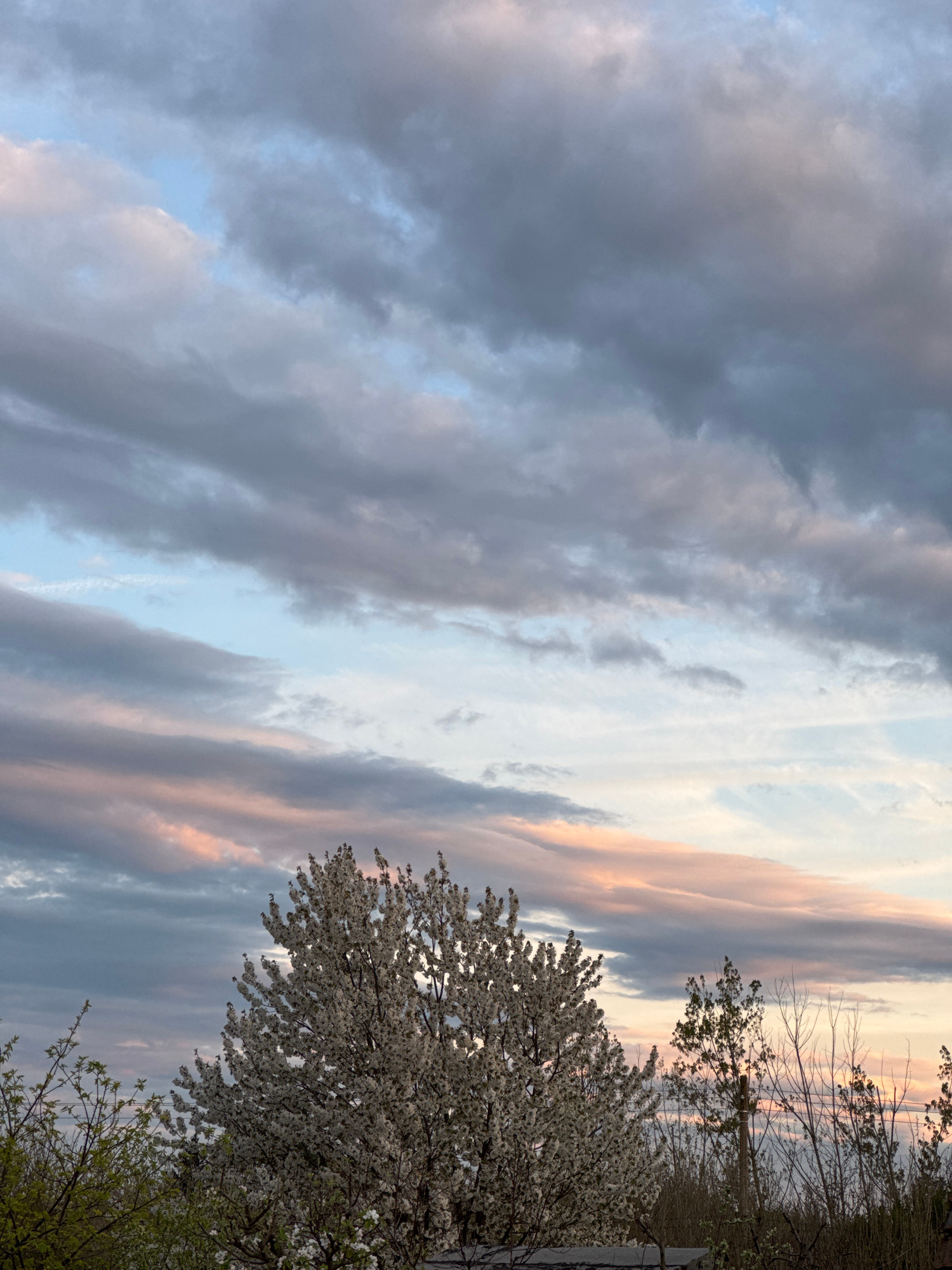 The image shows a sky with clouds and trees. The sky has long, horizontal clouds of gray, white, pink, and blue colors. The trees are on the right side of the image, with white blossoms on some trees.…read more