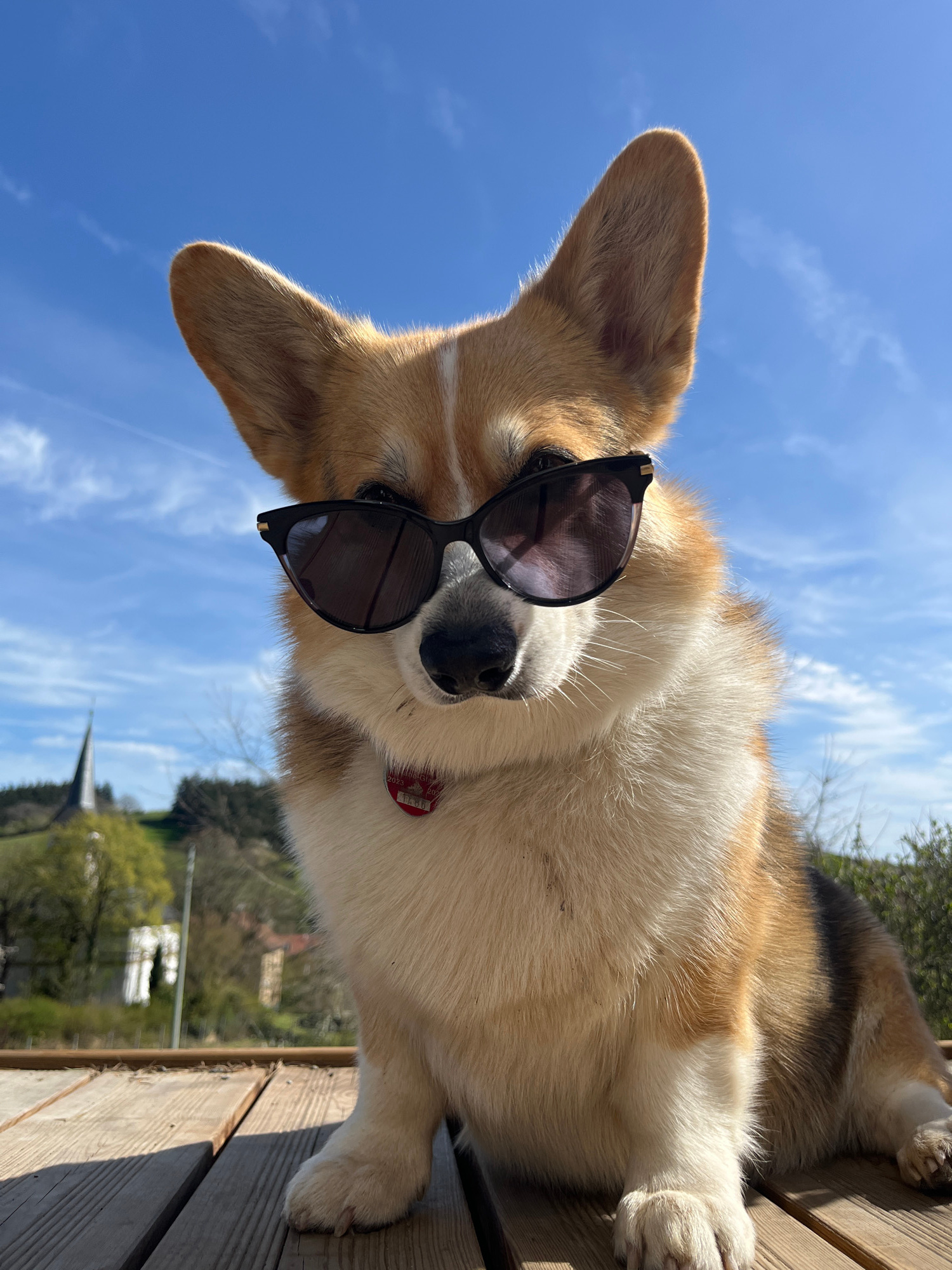 A dog wearing sunglasses is lying on a wooden surface. The dog is a corgi. A blue sky with light clouds is in the background. Trees and a building with a steeple are in the background. The location is…read more
