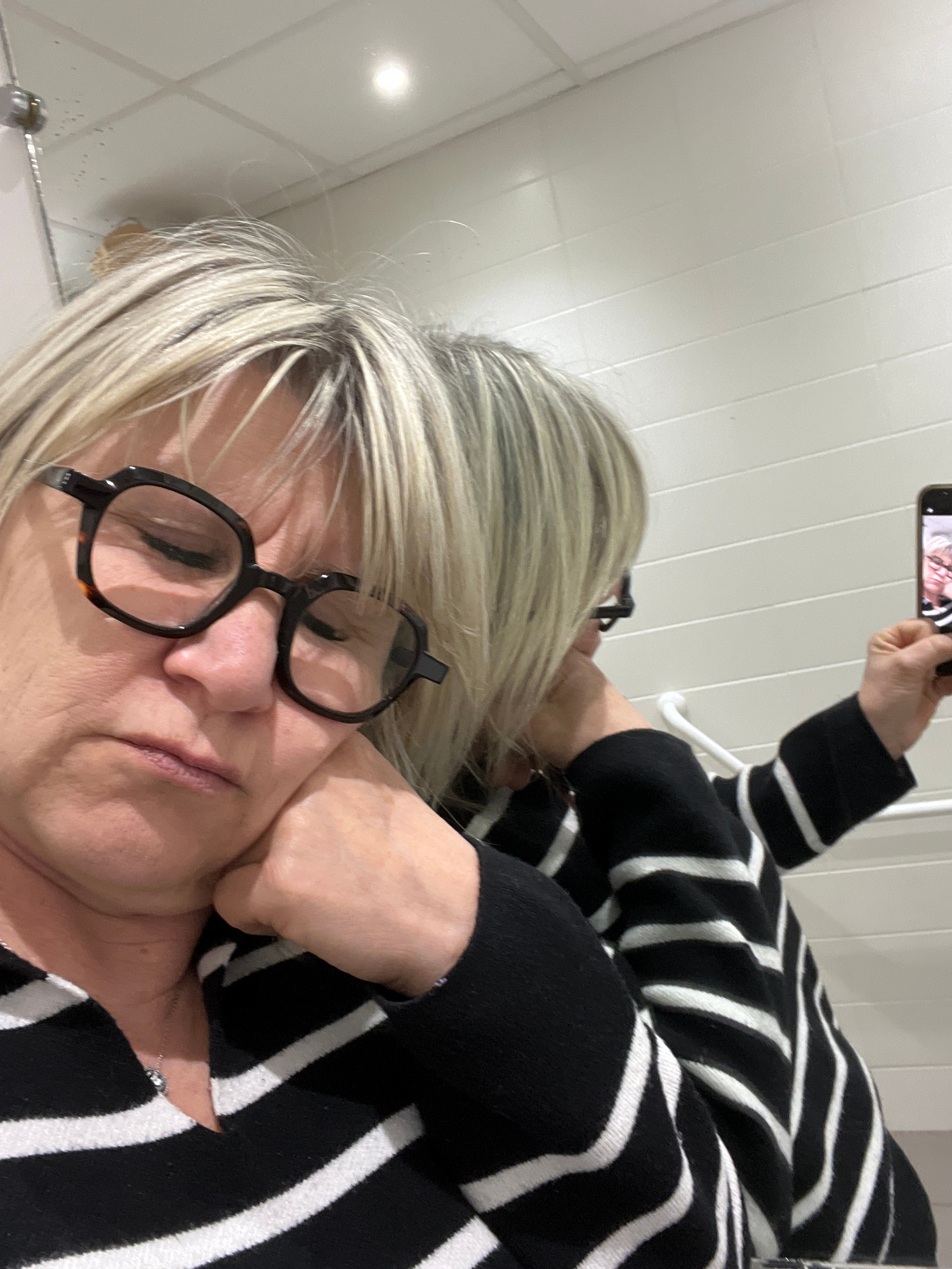 A woman is taking a selfie in a bathroom in La Fouillouse, France. She is wearing a black and white striped sweater and black glasses. She is holding a smartphone in her right hand to take the photo.…read more