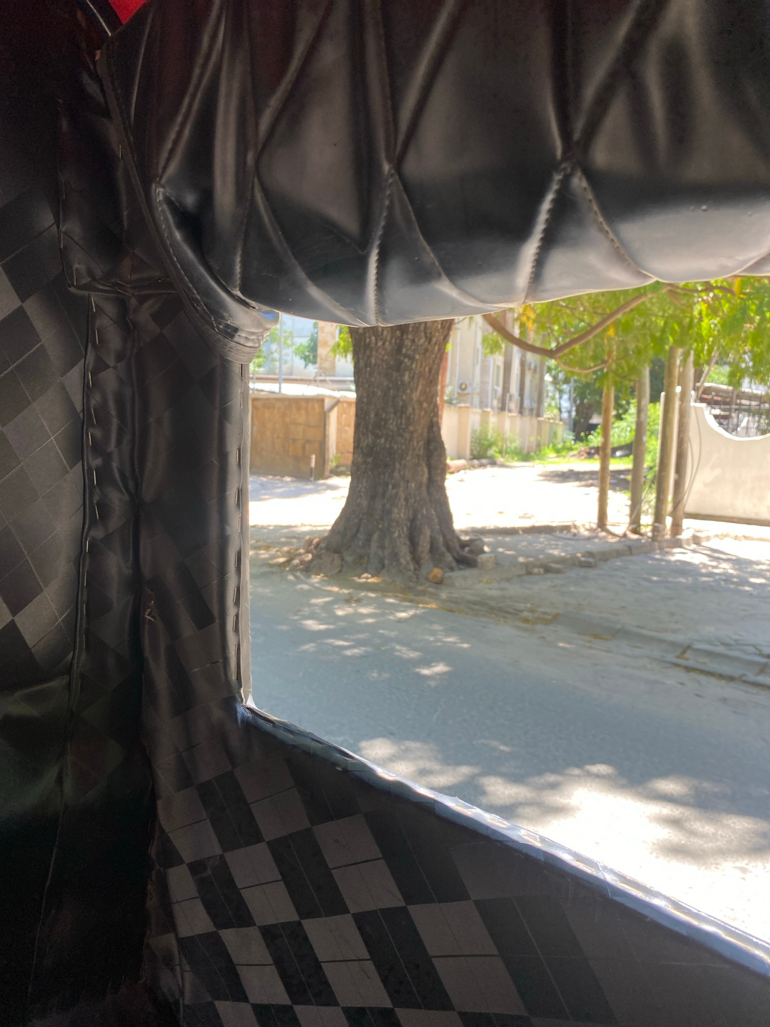 The image is taken from inside a vehicle, possibly a rickshaw or auto-rickshaw, looking out onto a street scene. The foreground is dominated by the interior of the vehicle, showing parts of the paddedβ¦read more
