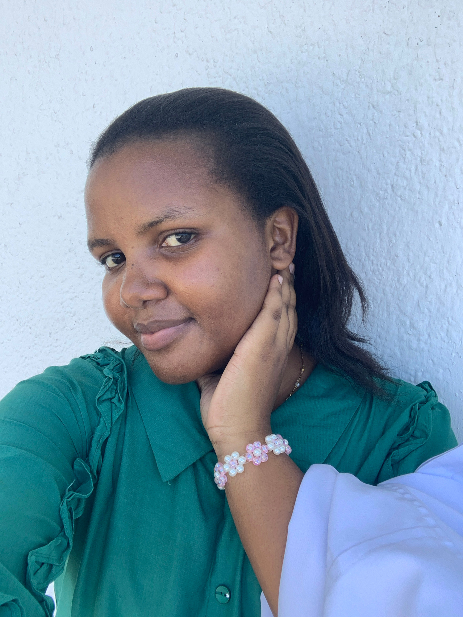 A woman is pictured indoors, smiling. She wears a green blouse and a pink and white flower bracelet. Her left hand is touching her face. Part of a white top is visible in the upper right corner. The b…read more