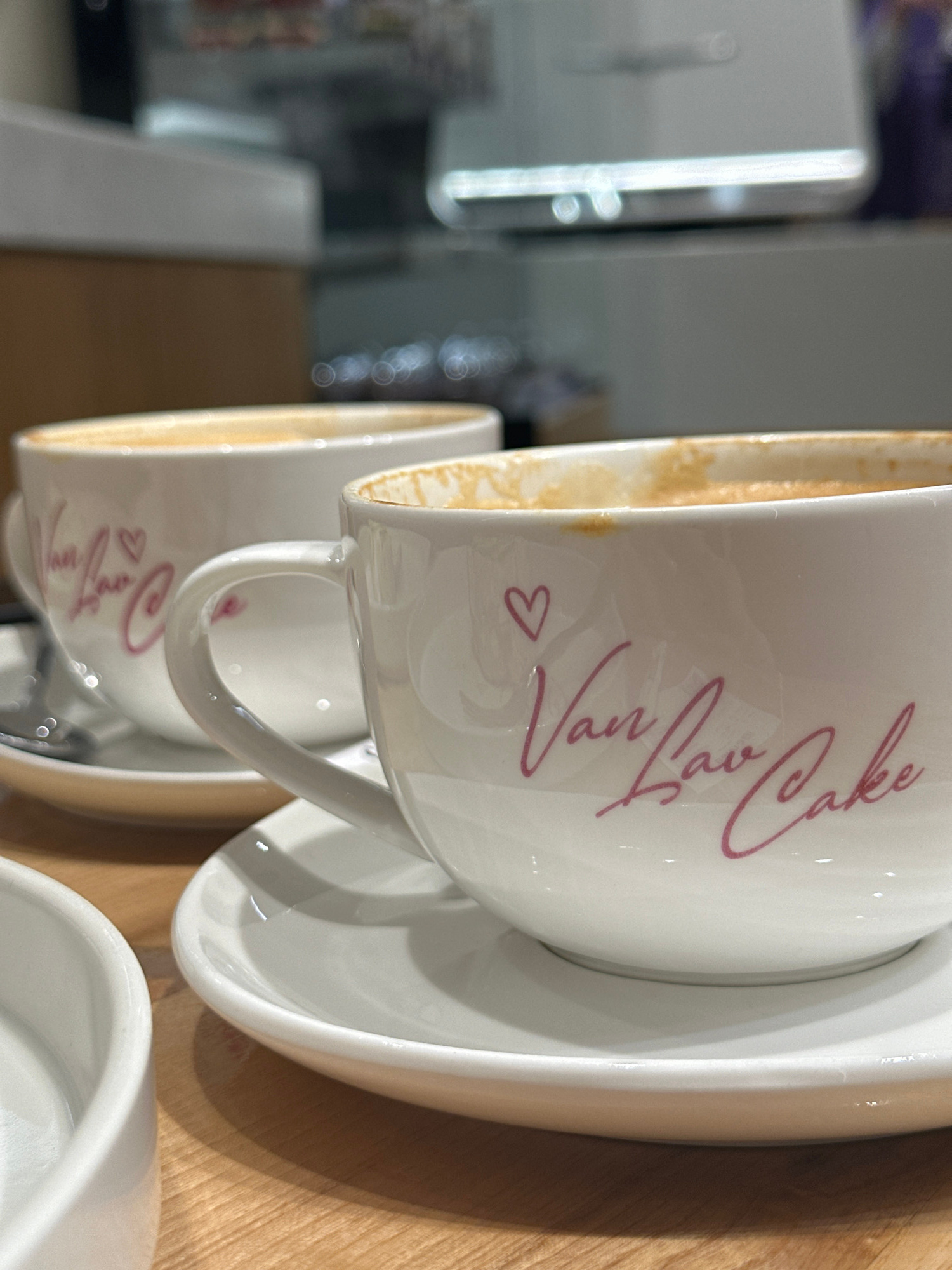 The image shows several white ceramic cups and saucers stacked on what appears to be a wooden surface. The cups have the words "Van Lav Cake" written on them in pink script, along with a small heart s…read more