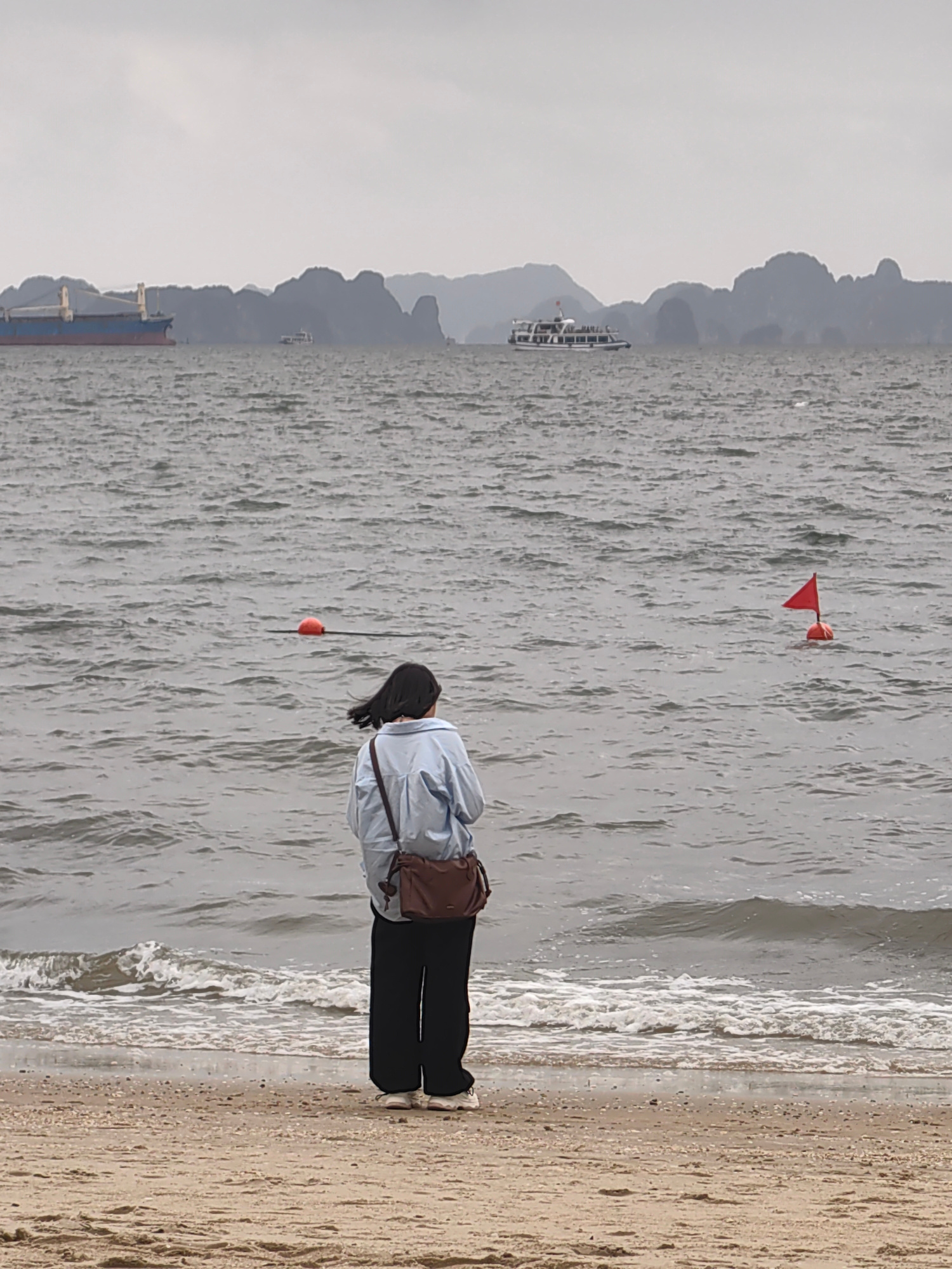 A person stands on a sandy beach facing the ocean in Bai Chay Ward, Vietnam. The person has dark hair and is wearing a light blue shirt, dark pants, and white shoes, with a brown bag slung over their…read more