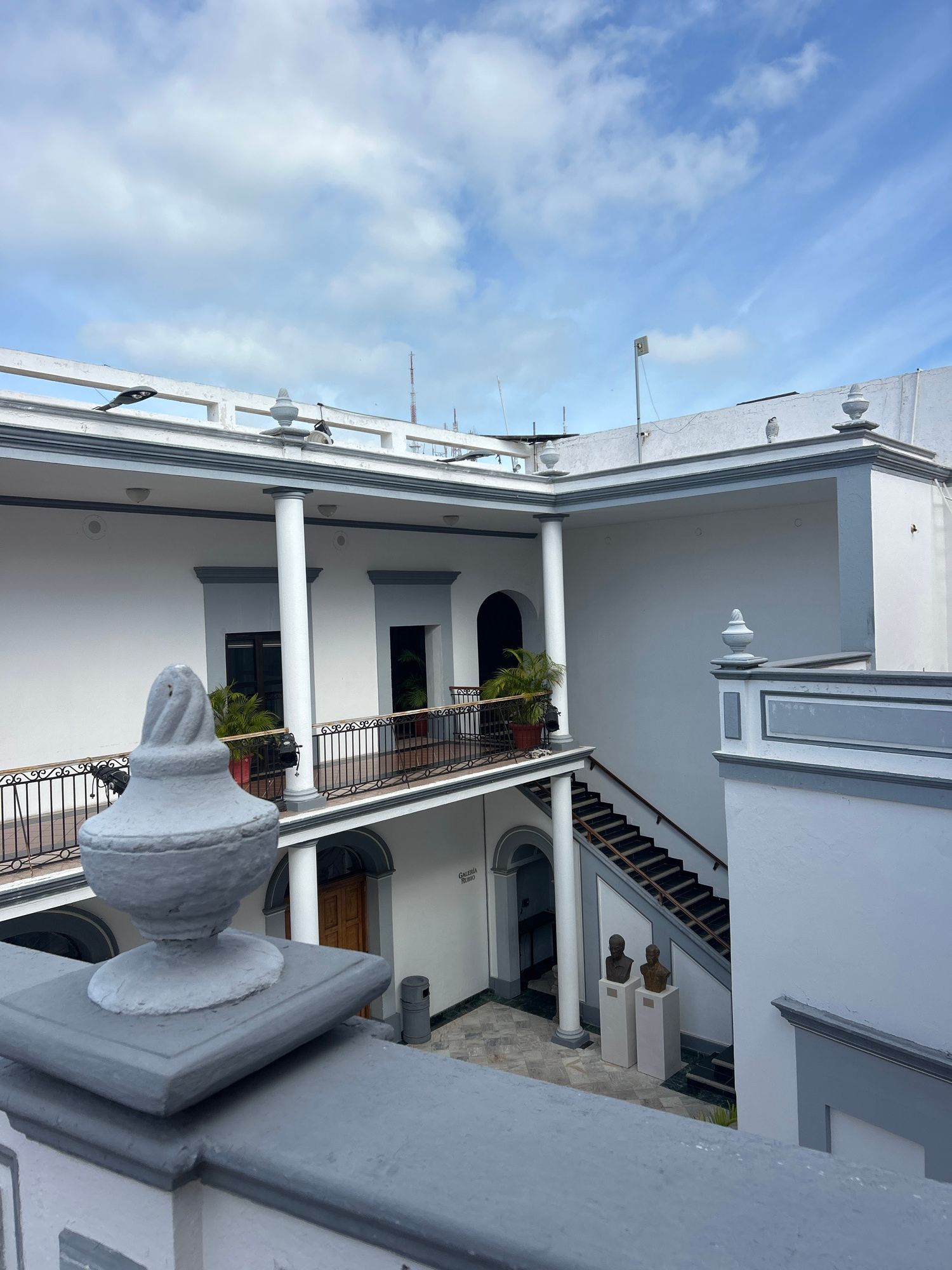 The image depicts an exterior view of a white multi-story building with gray trim, columns, and decorative architectural elements. The architecture features balconies with wrought iron railings and po…read more