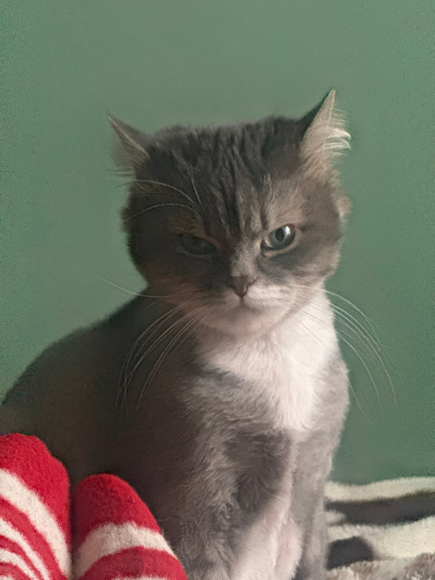 A gray and white cat is lying down, looking at the camera with its head tilted. The background is a solid green. A red and white striped object is in the bottom right corner of the frame. A gray and b…read more
