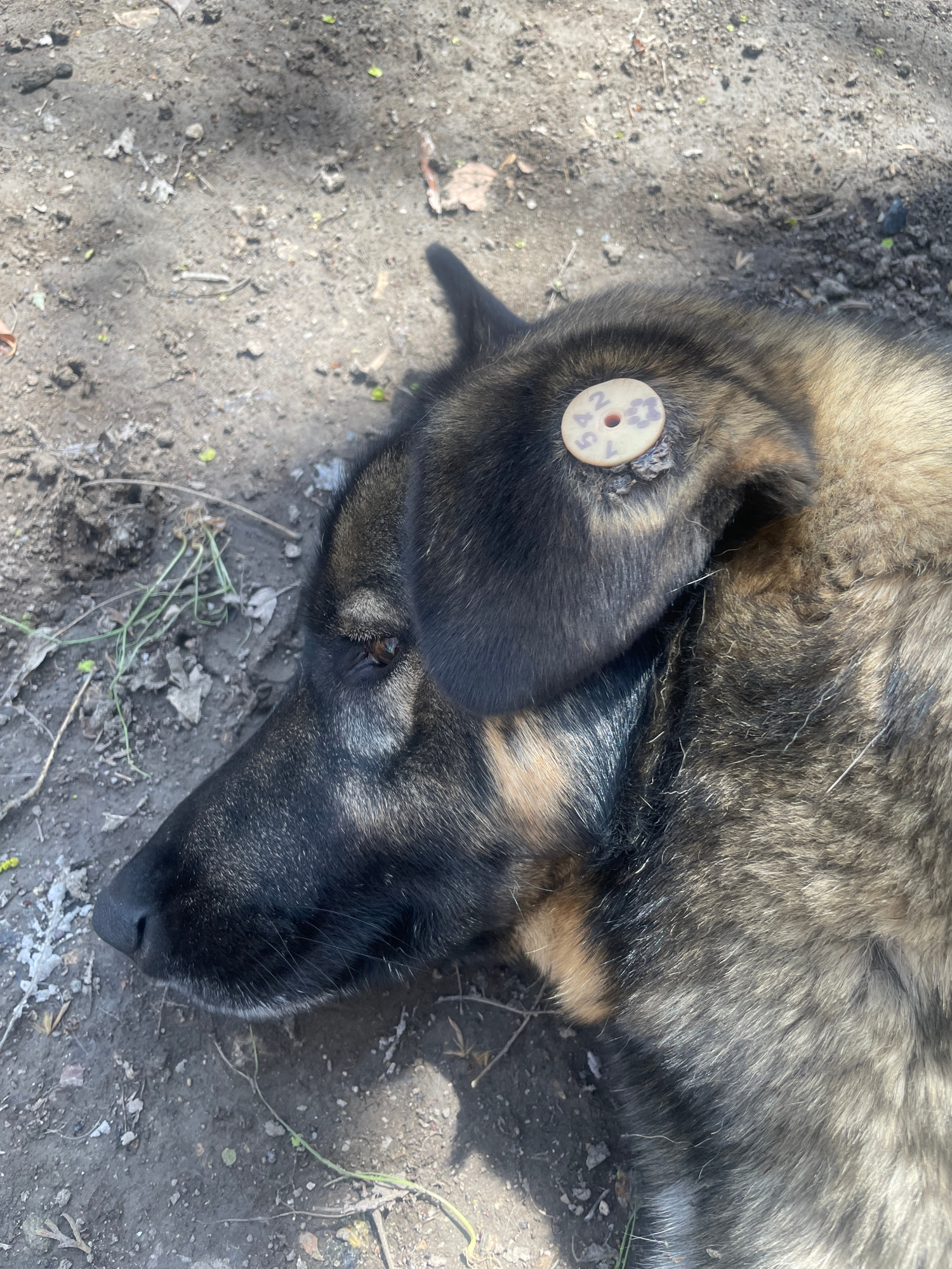 A dog with a beige ear tag, numbered "2154", lies on bare earth. The dog has dark fur on its head and muzzle, transitioning to lighter brown and grey fur on its body. It is resting with its head turneβ¦read more