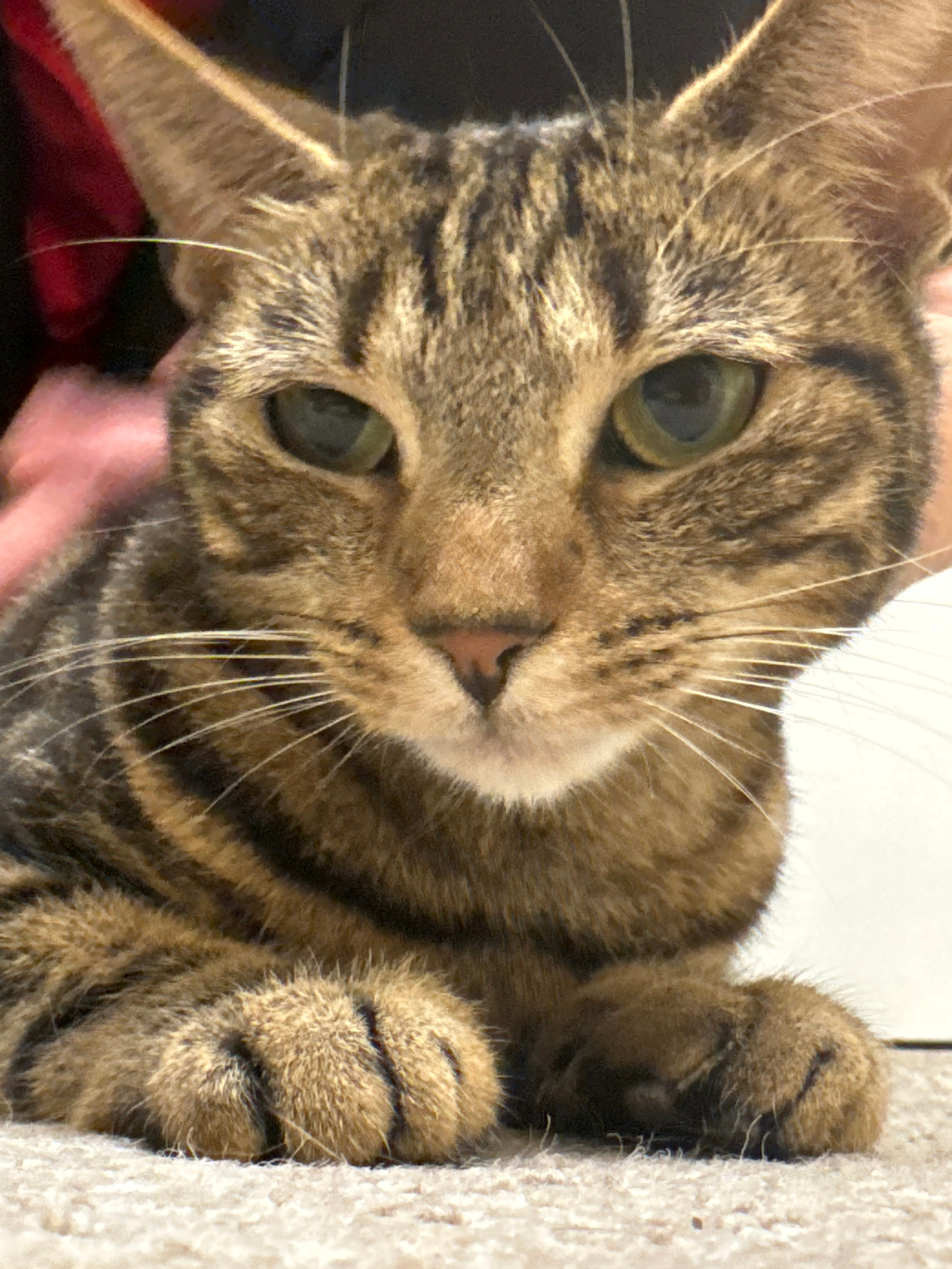 A close-up image features a brown tabby cat with green eyes. The cat's paws rest against a textured beige surface. The cat is looking towards the camera. The environment is blurry and out of focus. Th…read more