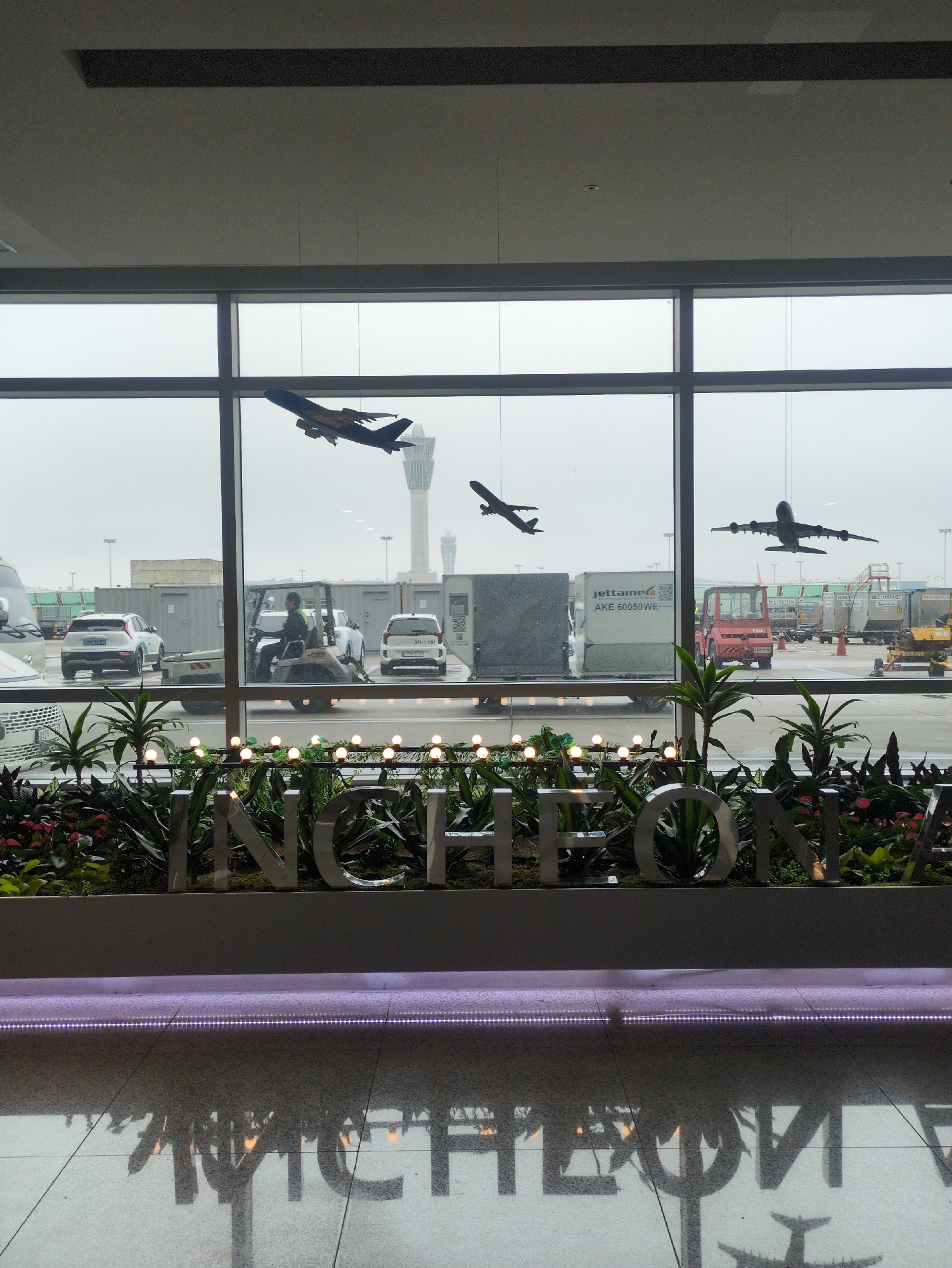 The image shows a view from inside Incheon International Airport in Incheon, South Korea. A large window provides a view of the tarmac and airport infrastructure including support vehicles, freight co…read more