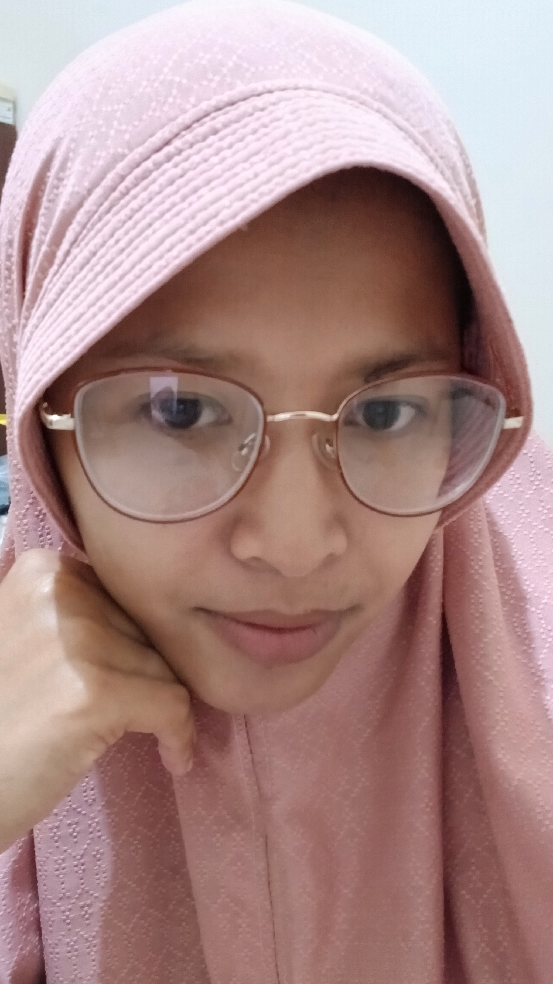 A person wearing a pink hijab and eyeglasses is looking directly at the camera. The person's right hand is touching their face. The photo appears to be taken indoors, likely in Lhokseumawe, Indonesia.…read more