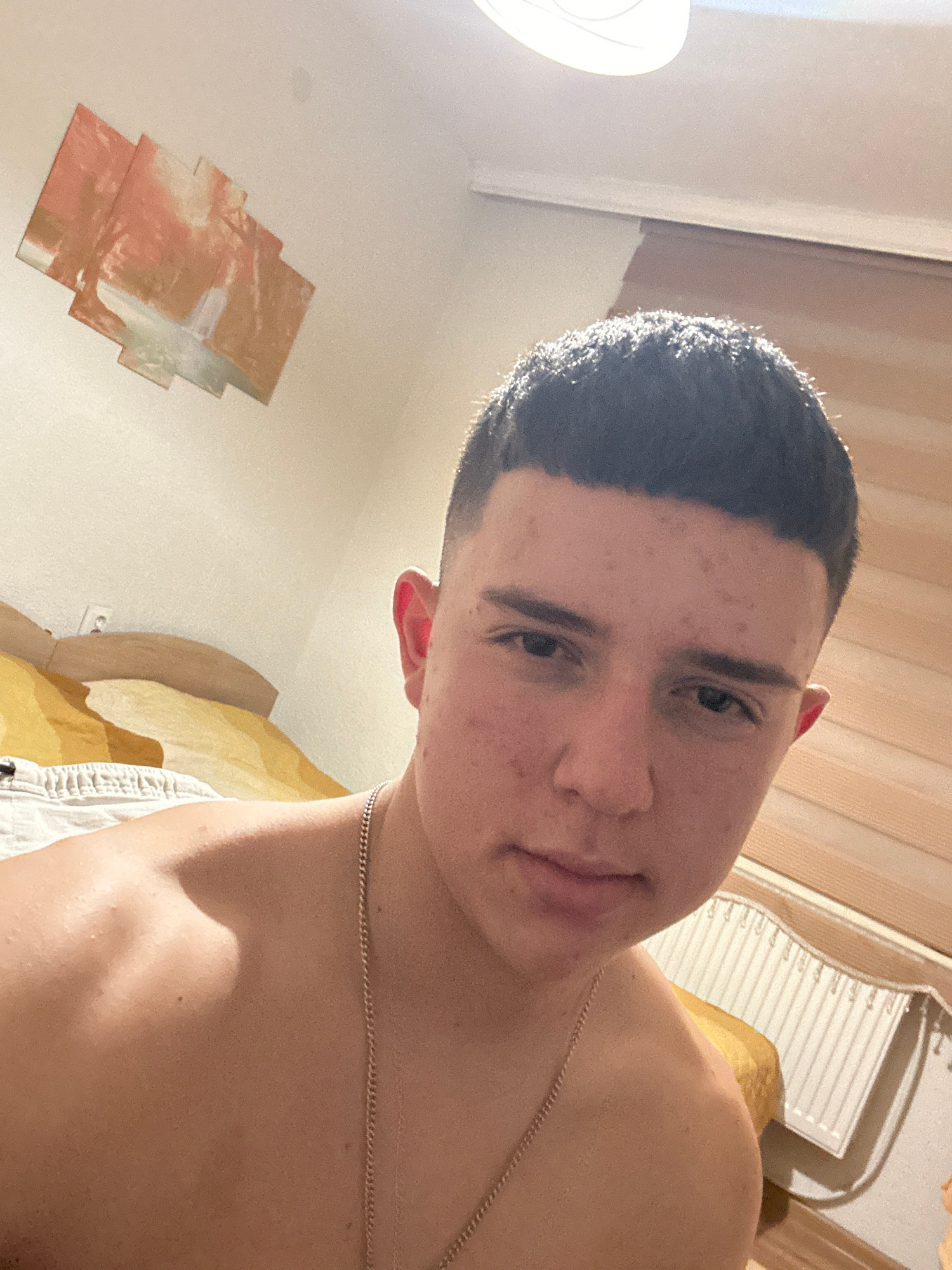 A selfie shot from a low angle features a light-skinned male with dark, close-cropped hair. He is wearing a thin silver chain around his neck and appears to be shirtless. The background consists of a…read more