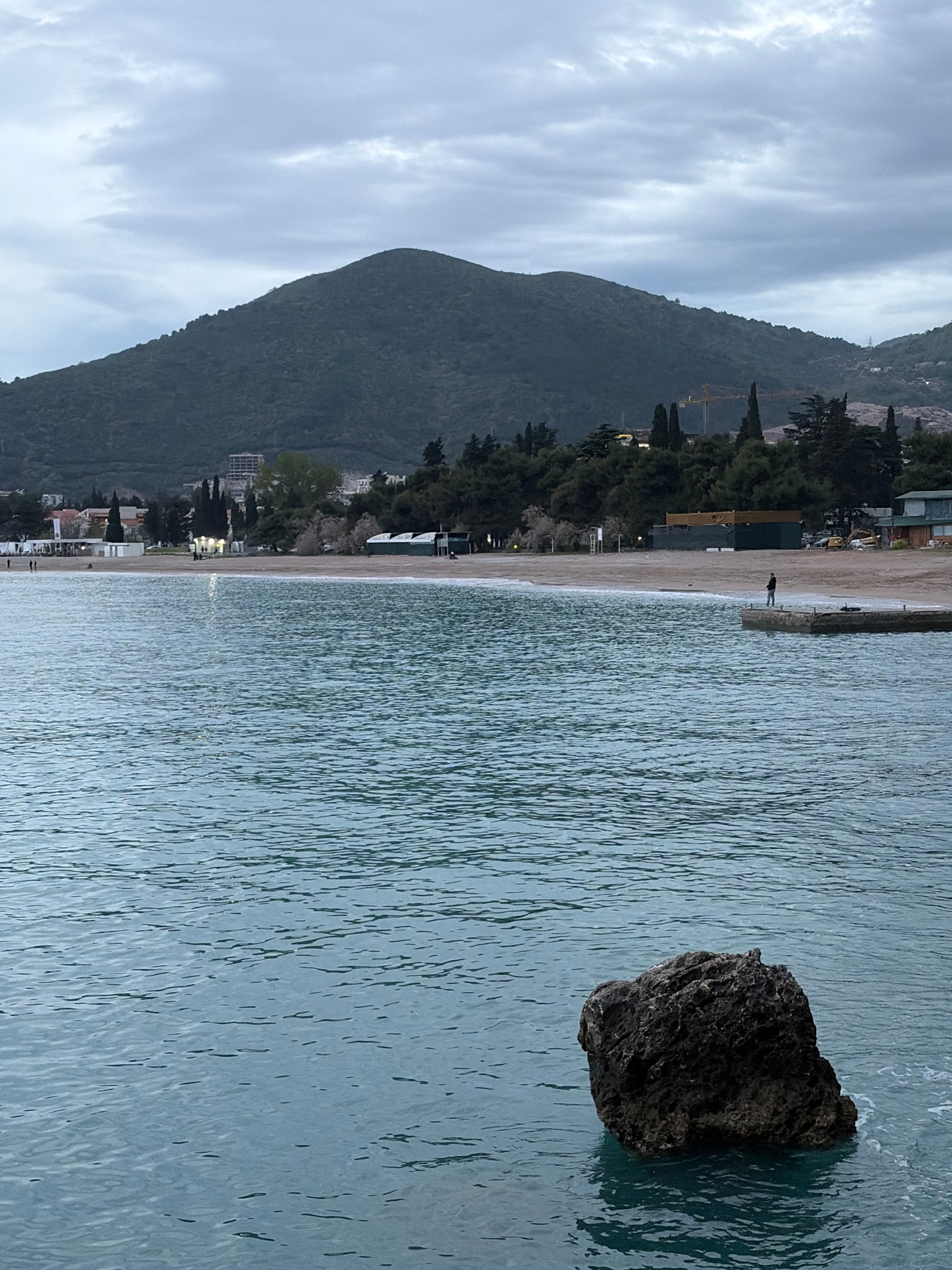 The image captures a scene in Budva, Montenegro, featuring a view of the coastline. A large mountain dominates the left side of the frame, gradually descending towards the coastline. A sandy beach run…read more
