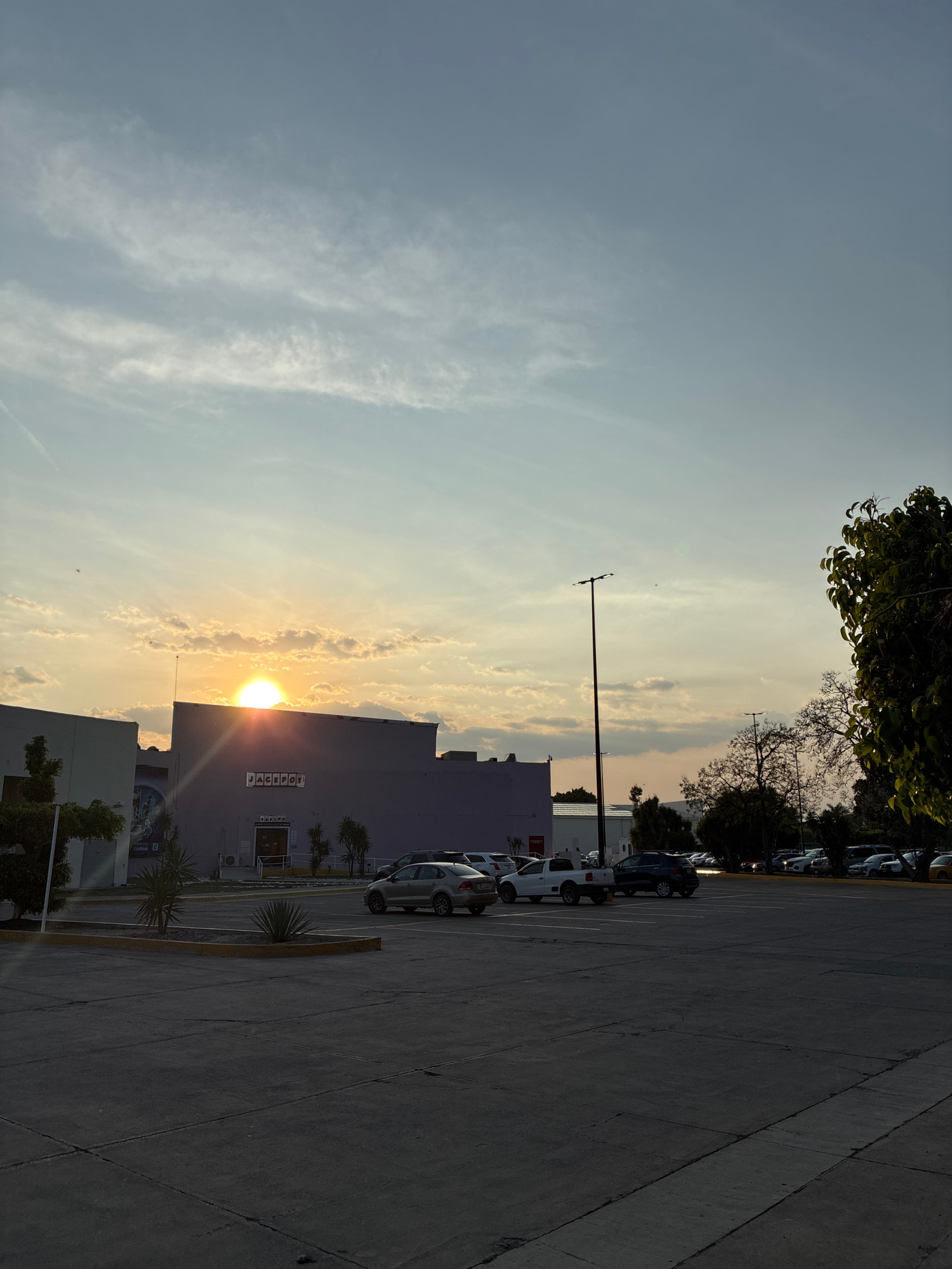 The image depicts a parking lot in Tehuacán, Mexico, at sunset. A large building with "JACKPOT CASINO" written vertically on its side is visible. Parked cars line the edge of the lot near the building…read more
