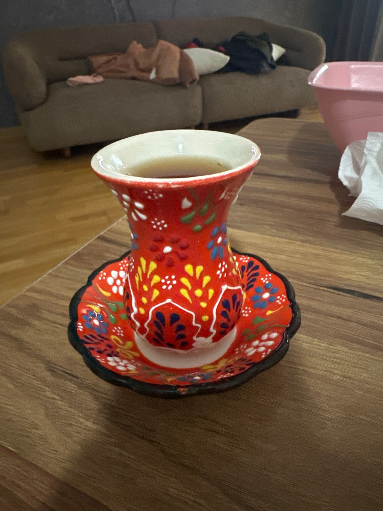 The image shows a red and white ceramic vase with blue, green, and yellow floral patterns. The vase has a flared top and sits on a matching saucer with a black rim. The vase is resting on a wooden surβ¦read more