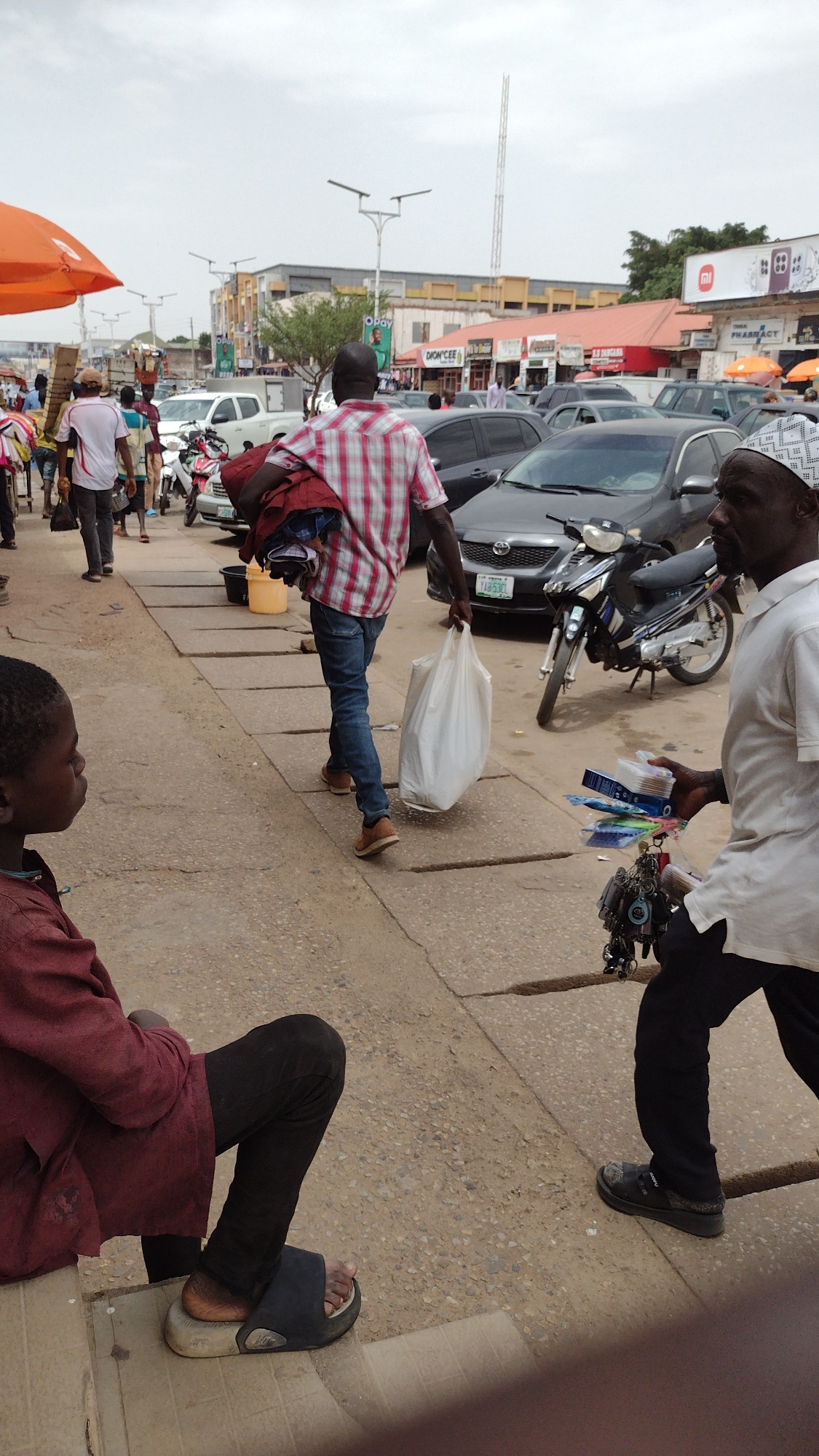 The image, taken from a low angle, captures a street scene in Jos, Nigeria. The ground is paved with concrete. A man in a red and white plaid shirt, blue jeans, and brown shoes is walking, carrying a…read more