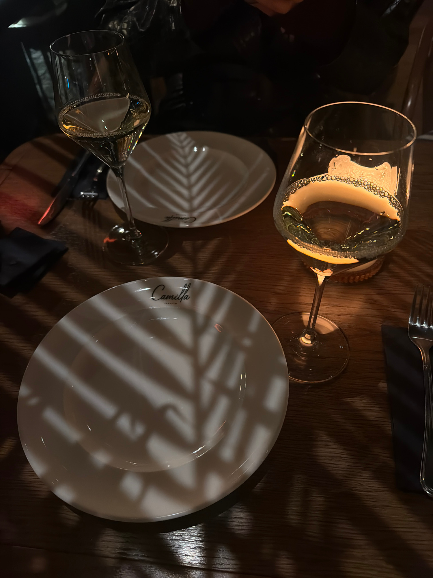 The image depicts a table setting at what appears to be a restaurant. Two white plates are visible, one larger than the other, both bearing the logo "Camilla Yerevan" indicating the location is in Yer…read more