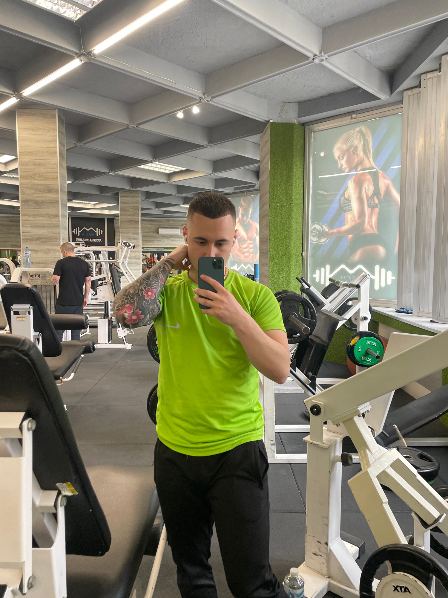 The image depicts a man taking a selfie in what appears to be a gym. He is wearing a neon green t-shirt and black pants, and he has a tattoo on his left arm. The gym has weight machines and a poster o…read more