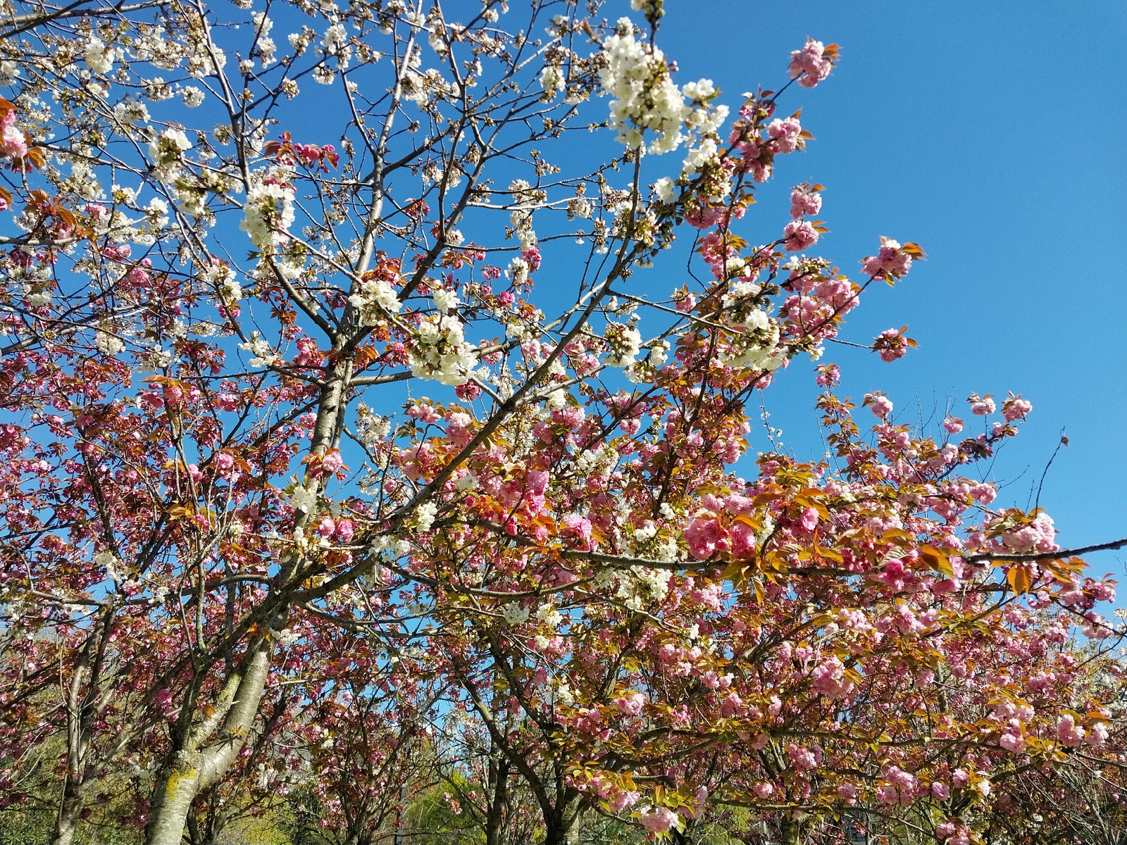 The image presents a vibrant outdoor scene, dominated by flowering trees against a brilliant, cloudless blue sky. The frame is filled with numerous tree branches, densely covered in blossoms of varyin…read more
