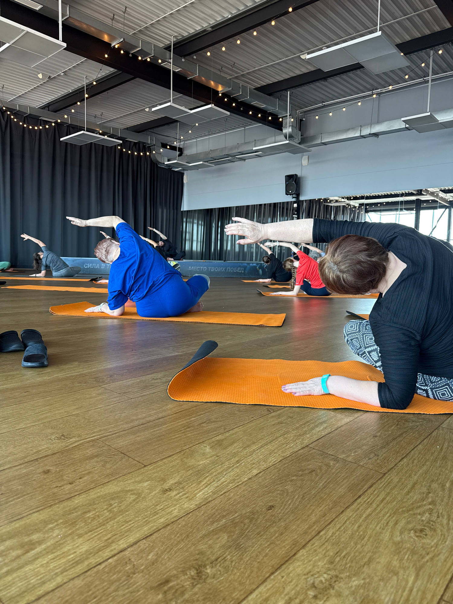 The image shows a yoga class in progress in Votkinsk, Russia. Multiple people are on orange yoga mats performing a bending exercise. They are lined up in a single row, with a woman in a black top andβ¦read more