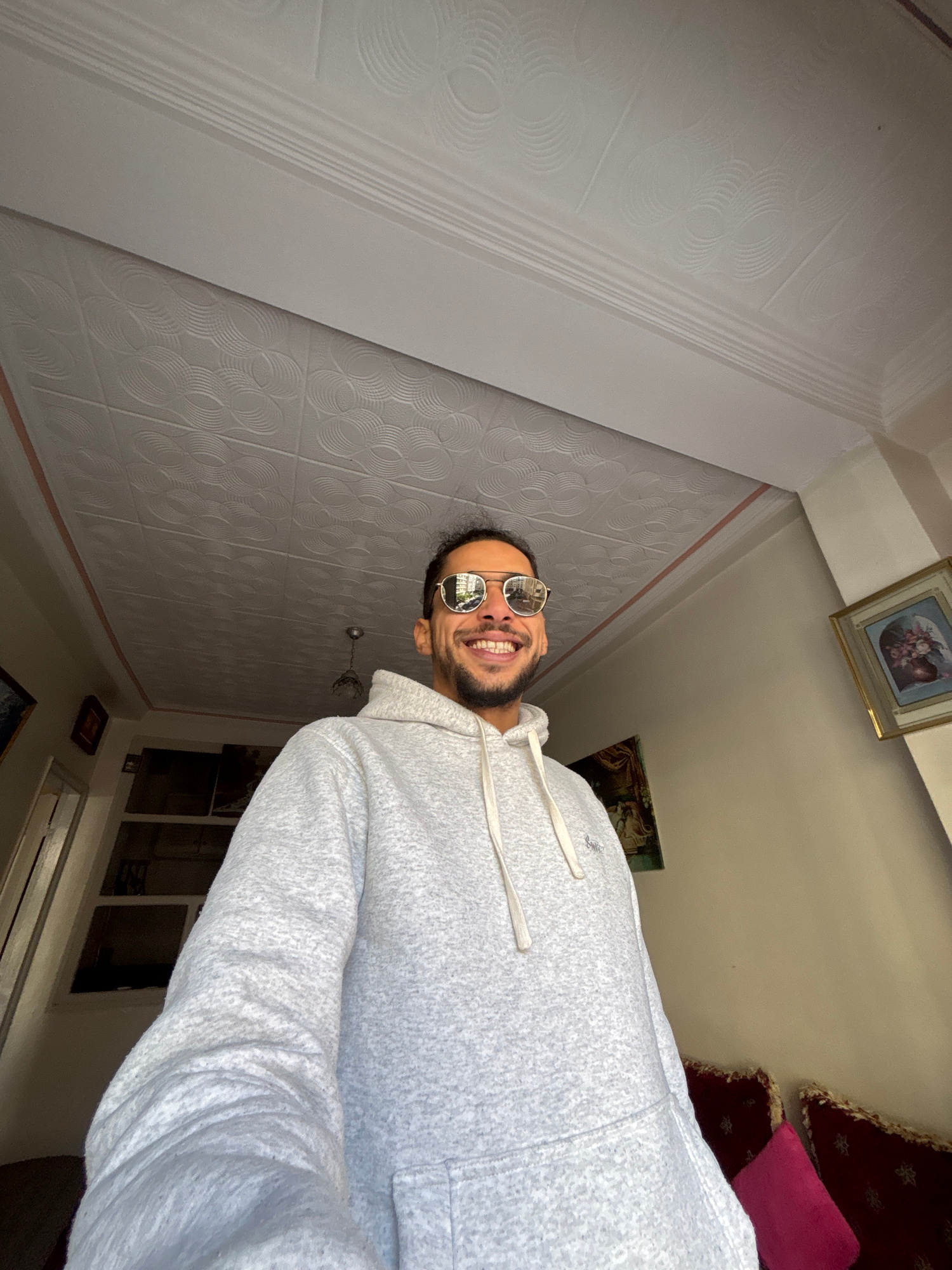 A male individual is depicted indoors, smiling broadly and looking directly at the camera, consistent with a selfie. He wears mirrored aviator sunglasses and a light grey, speckled hooded sweatshirt w…read more