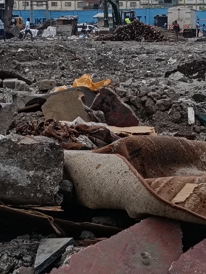 The image depicts a large outdoor demolition or construction site in Nairobi, Kenya, characterized by extensive rubble and debris. In the foreground, fragmented concrete slabs, broken red bricks, and…read more