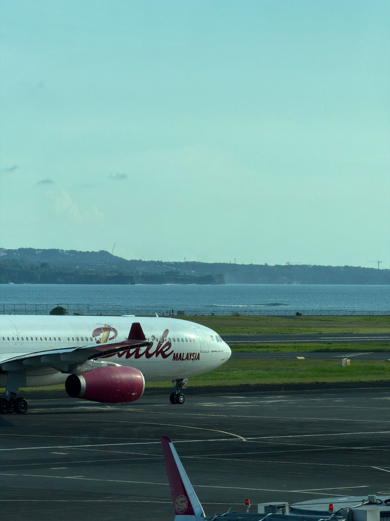 The image depicts a Batik Air Malaysia airplane on a runway. In the background is a coastal area. The airplane is positioned in the center, with one wing visible to the right, and the fuselage extendi…read more