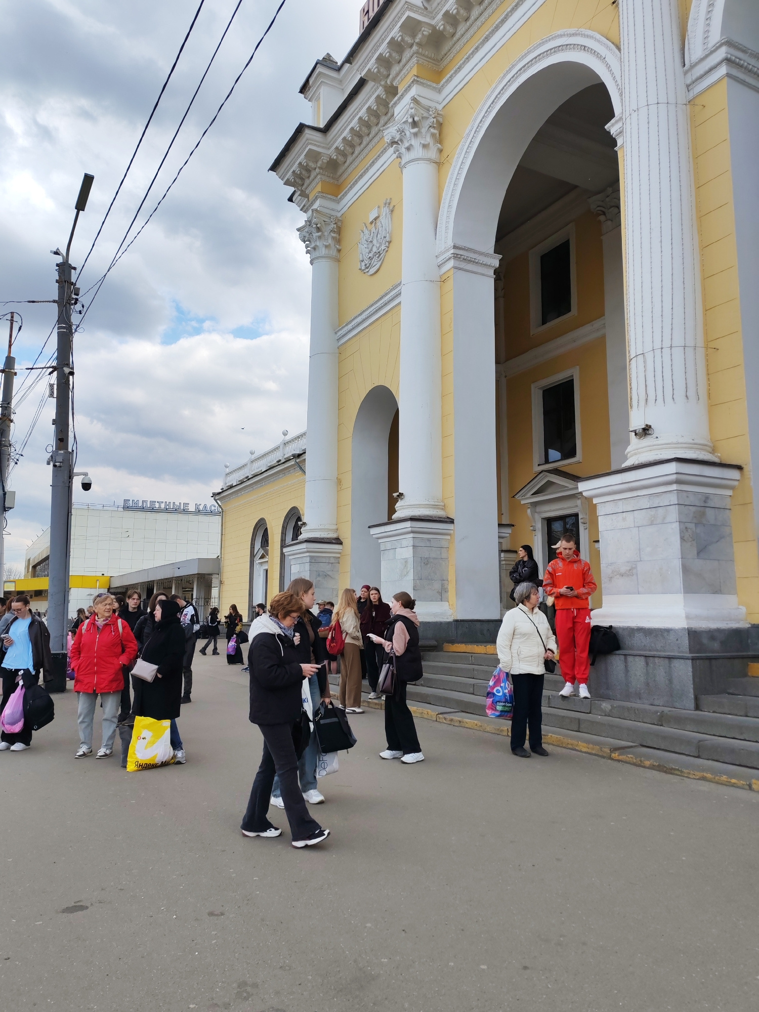 The image depicts an outdoor scene in front of a grand, classical-style building, likely a train station in Yaroslavl, Russia. The prominent building features a vibrant yellow facade contrasted with e…read more