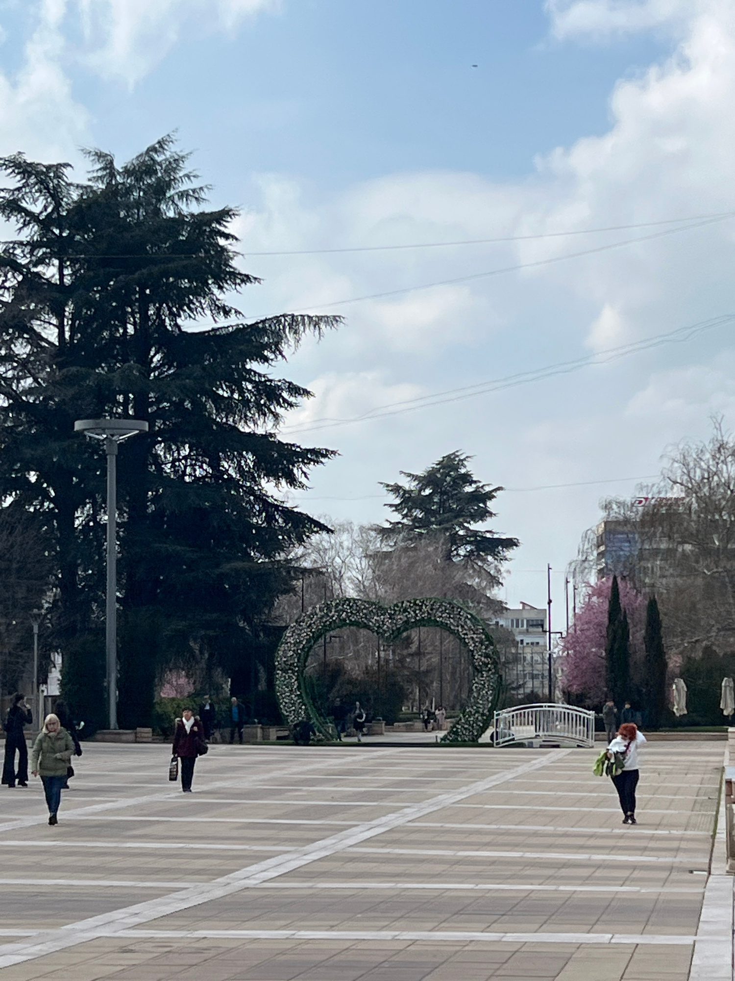 The image shows a public square in Yambol, Bulgaria. Several people are visible walking across the paved area. A large, heart-shaped floral arrangement stands near a white metal fence and flowering tr…read more