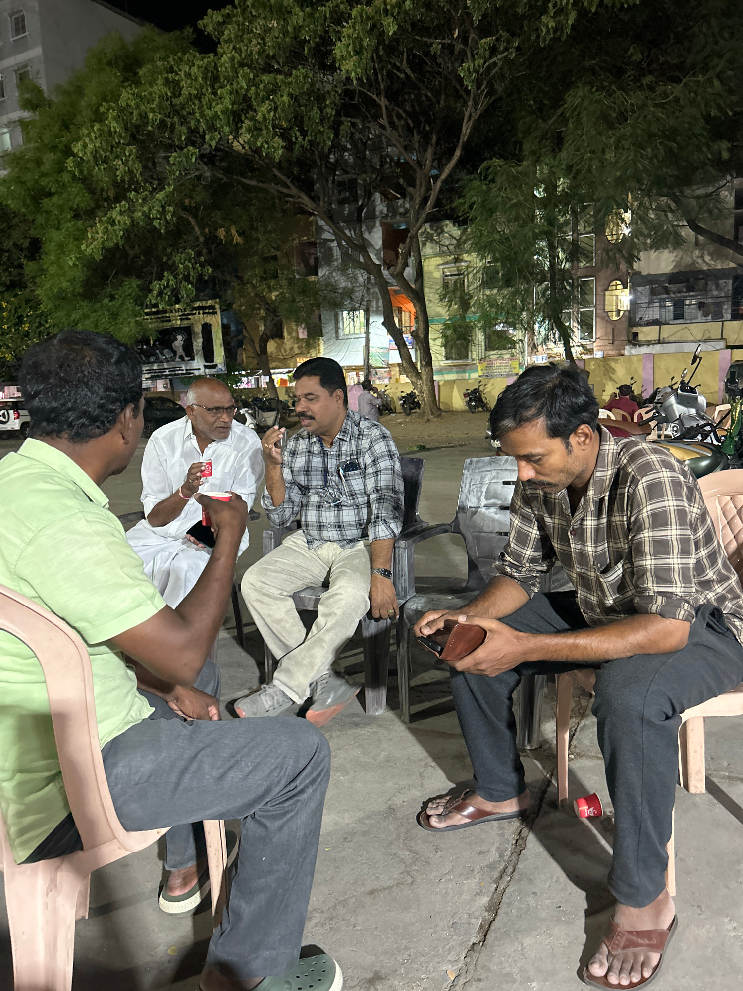 A group of four men are seated in plastic chairs outdoors at night in Puttaparthi, India. The man in the lower right wears a light green shirt and gray pants. The man in the white shirt and glasses is…read more