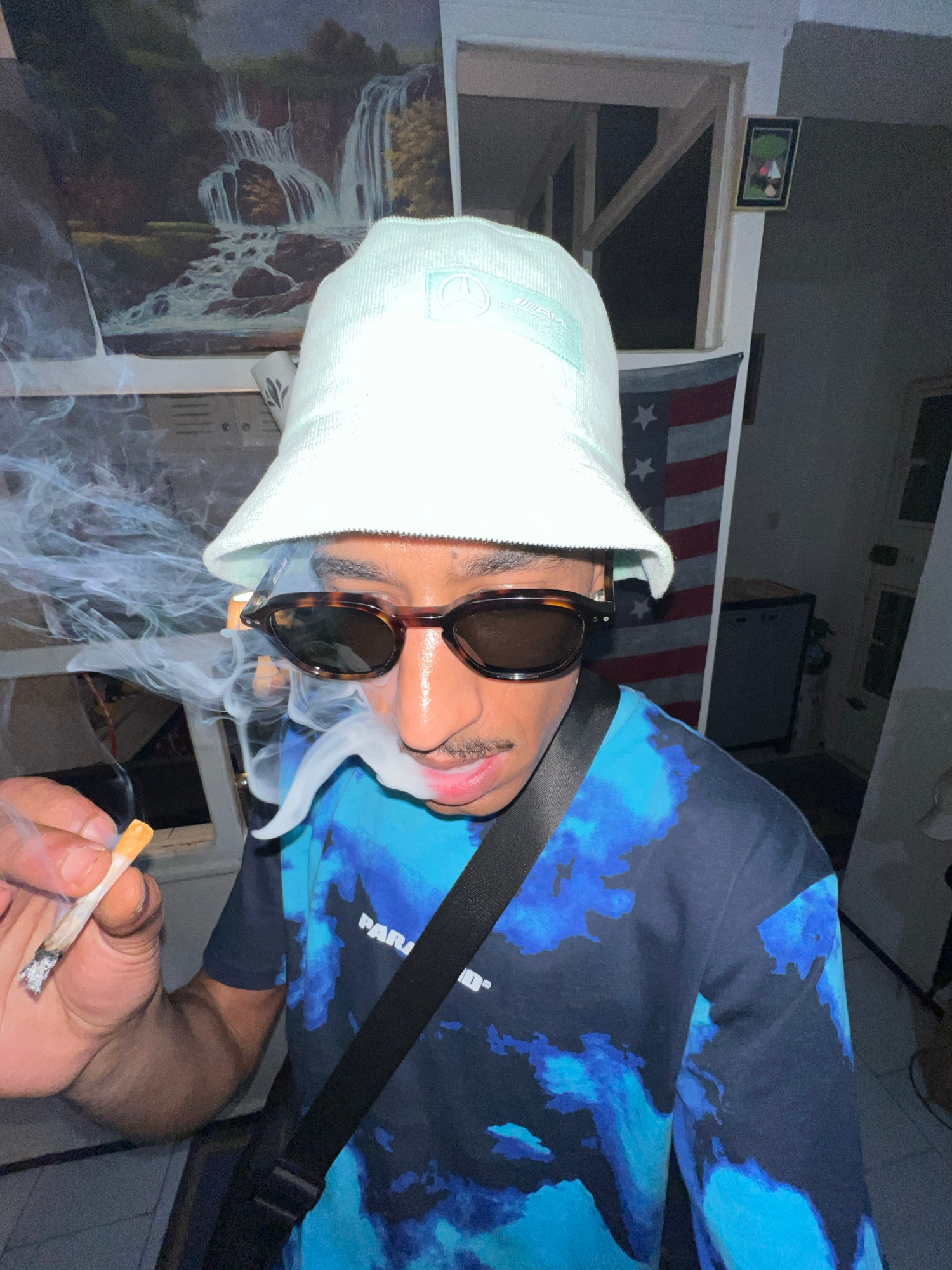 A person wearing a light green bucket hat, dark sunglasses, and a blue patterned hoodie is smoking what appears to be a marijuana cigarette. A black strap crosses their body. Smoke billows from the ci…read more