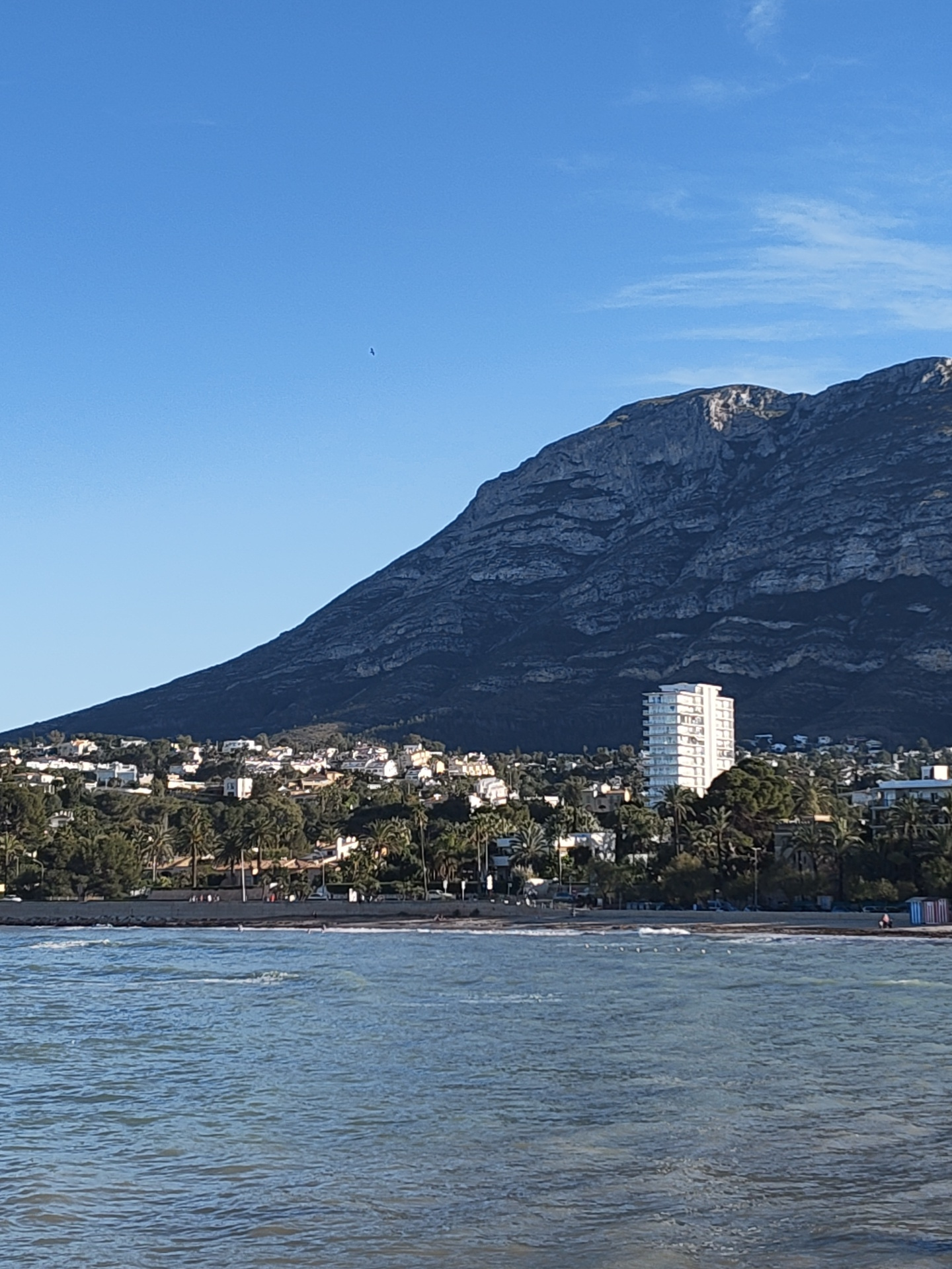 The image shows a coastal view in Dénia, Spain. In the foreground is the Mediterranean Sea, with visible waves. Behind the sea, a beach is lined with sparse vegetation and a few indistinct figures, in…read more
