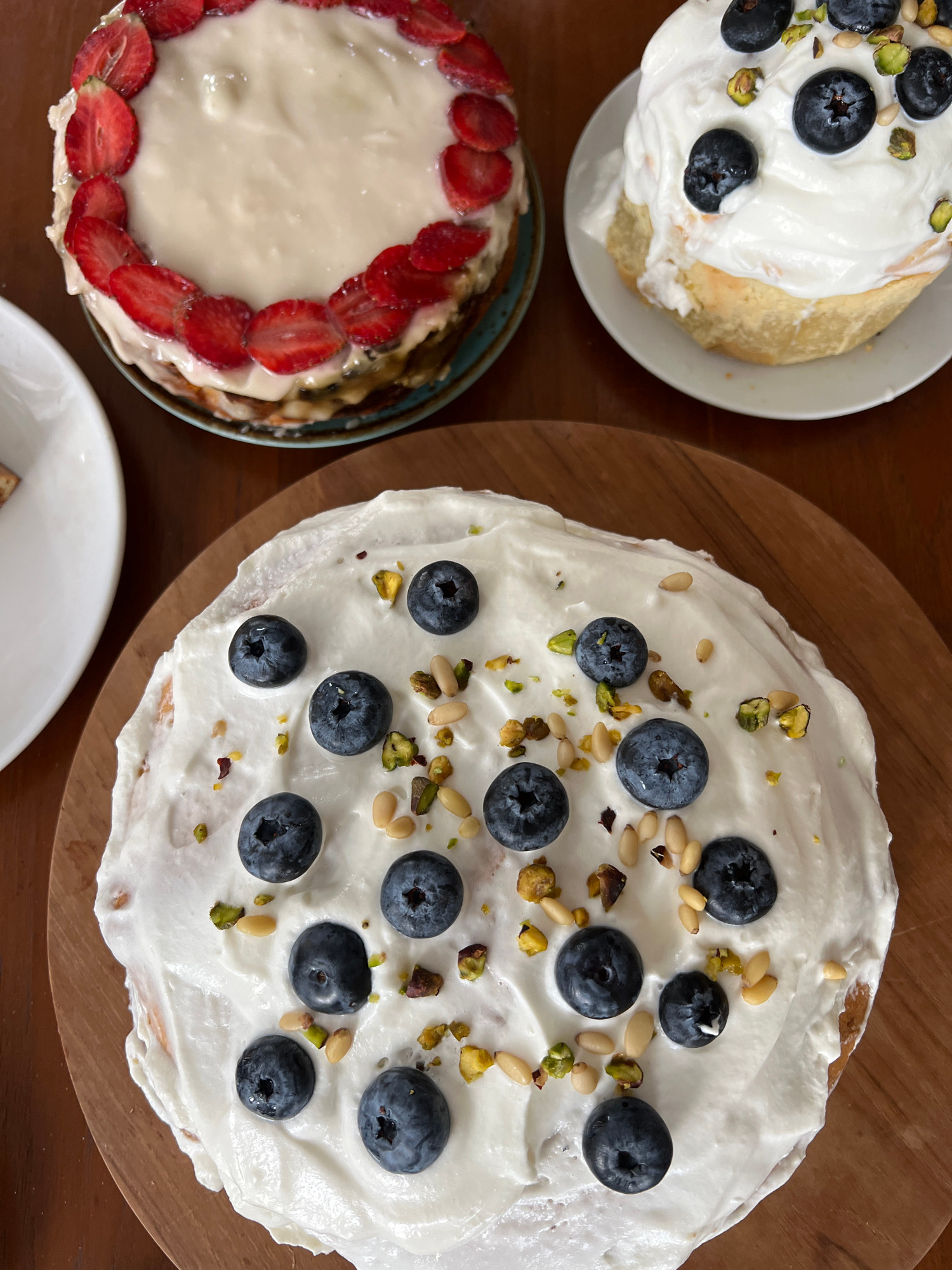 A high-angle, natural light shot shows three cakes on a wooden surface, possibly a table, in what appears to be a residential or dining area. The scene is likely located in Singakerta, Indonesia, base…read more