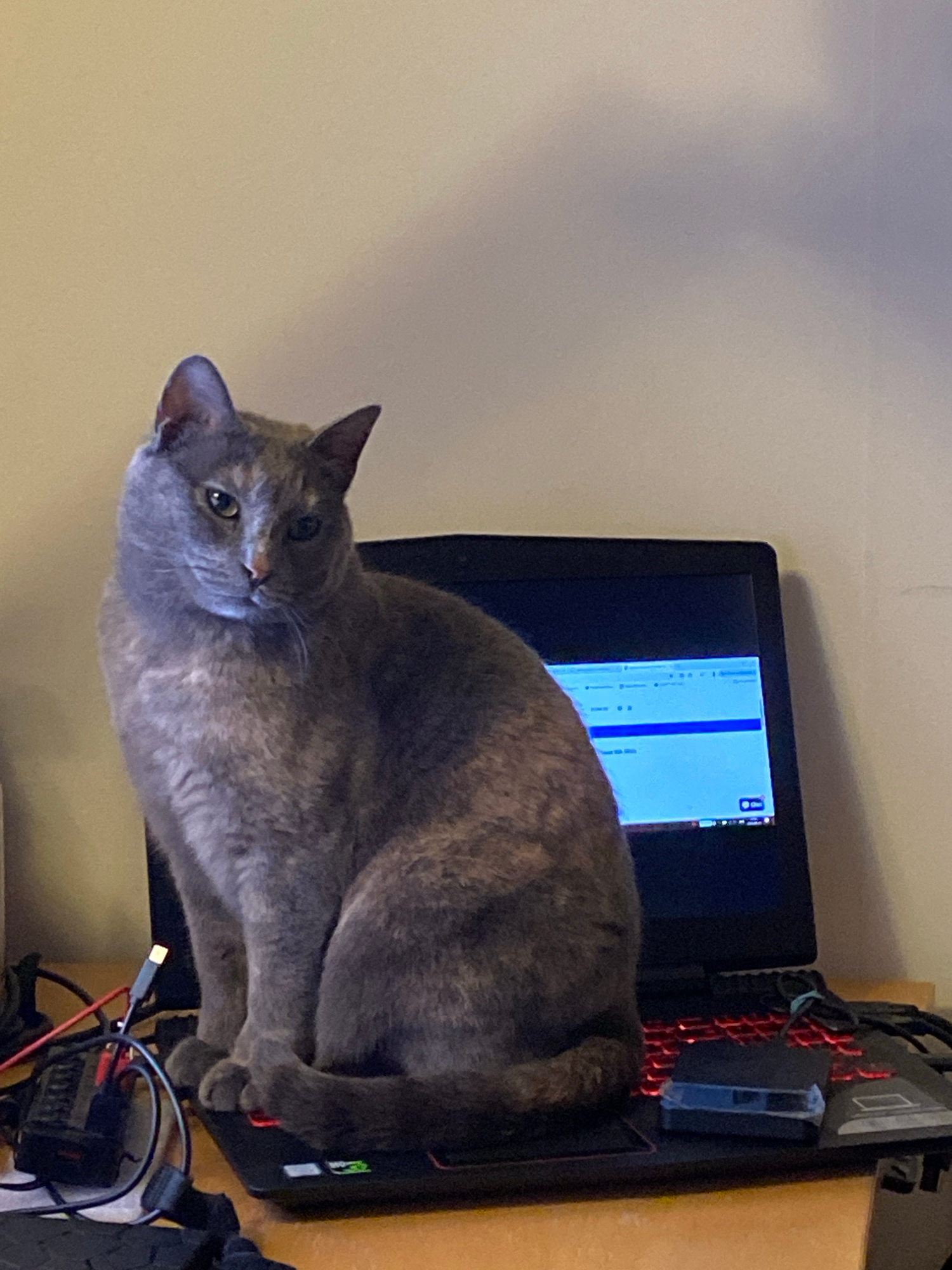 A gray cat is lying on a black laptop. The laptop is on a wooden desk, and a monitor is open behind it. There are electronics with wires beneath the laptop. The wall behind the desk is beige. Björklin…read more