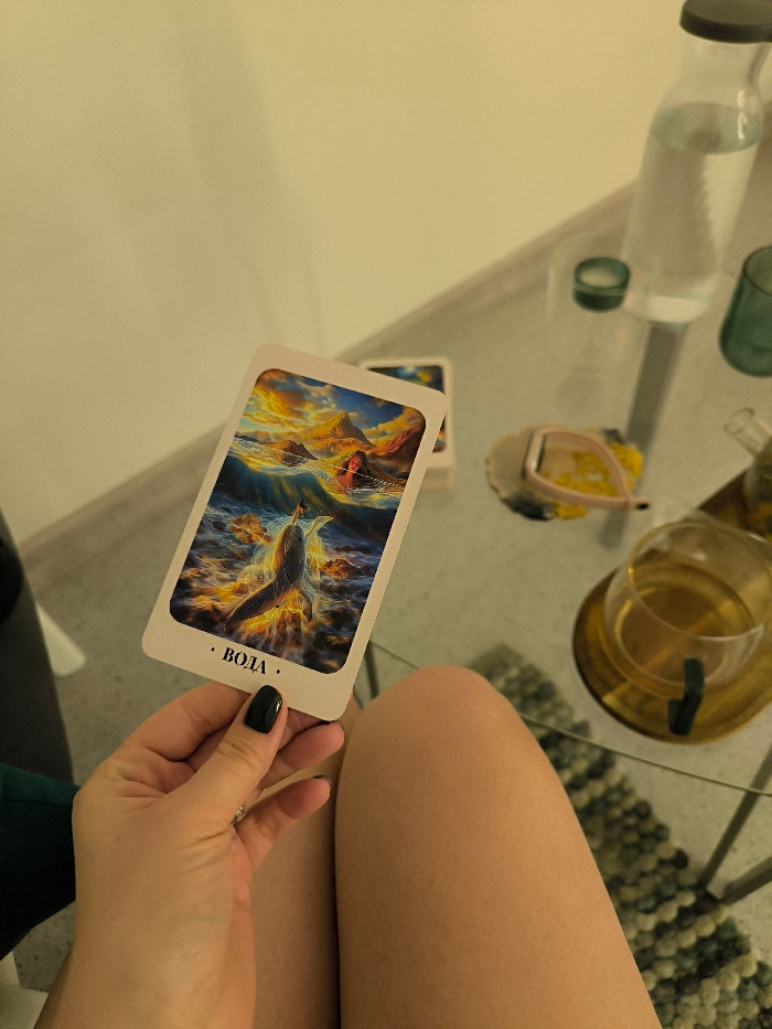 An indoor scene is depicted from a slightly elevated perspective. A person's left hand, with black nail polish and a silver ring on the ring finger, holds a rectangular card vertically. The card illus…read more