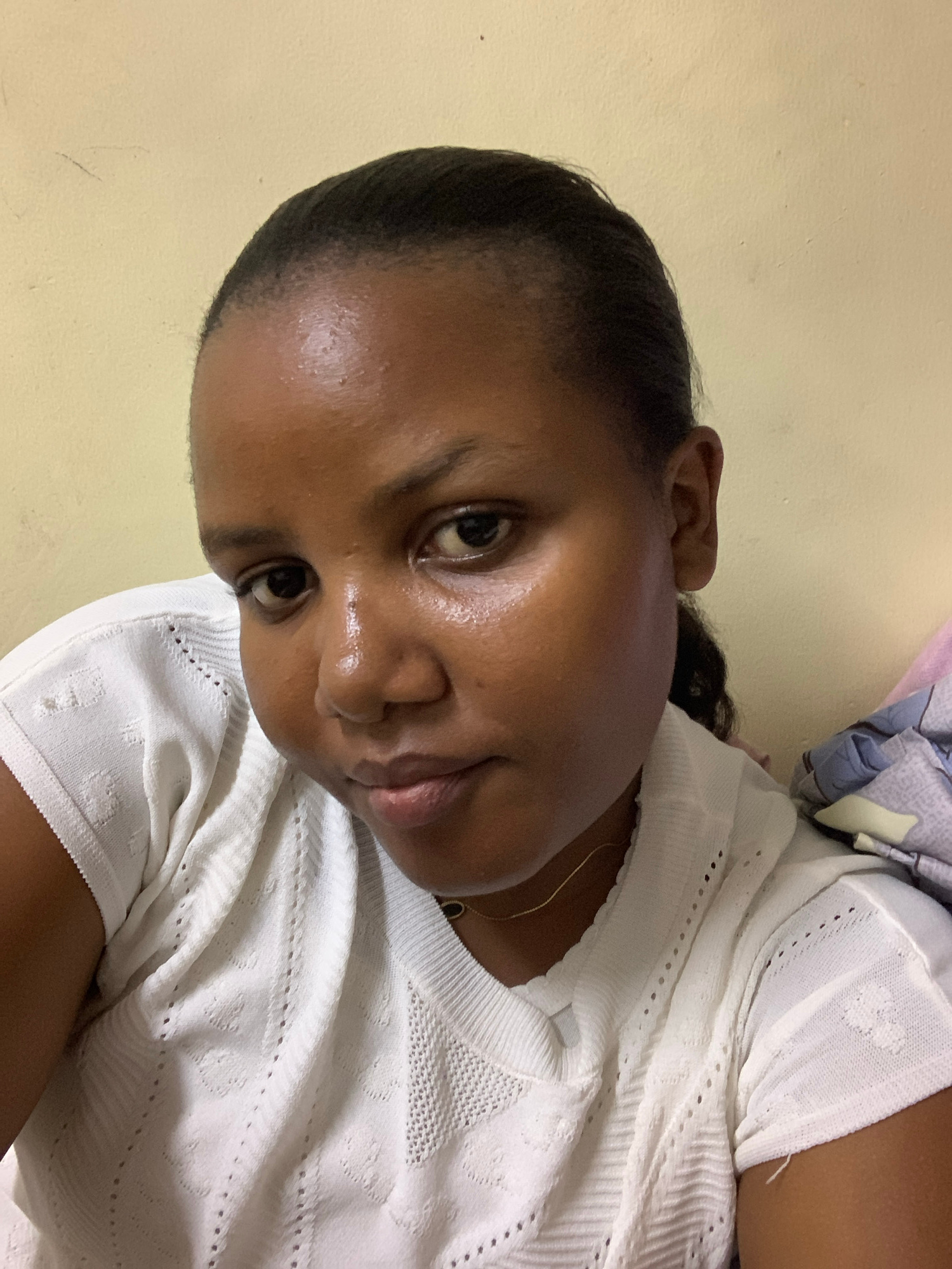 A dark-skinned woman with short black hair is positioned in a vertical orientation against a pale yellow wall. She is wearing a white knit top. A gold chain is visible around her neck. A partially vis…read more