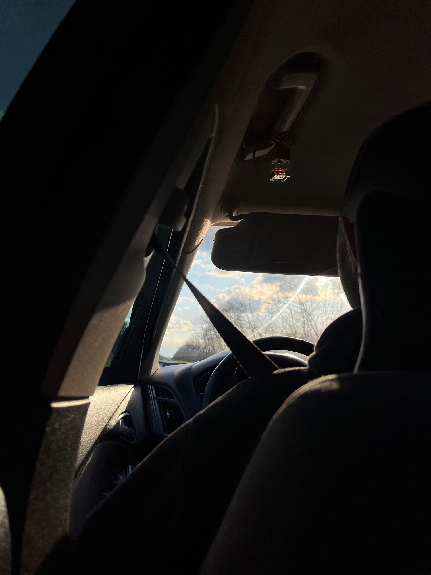 The image captures an interior view from a car, looking out through the front windshield and the passenger-side window. The scene is strongly backlit by a bright sun, creating prominent glare and rend…read more