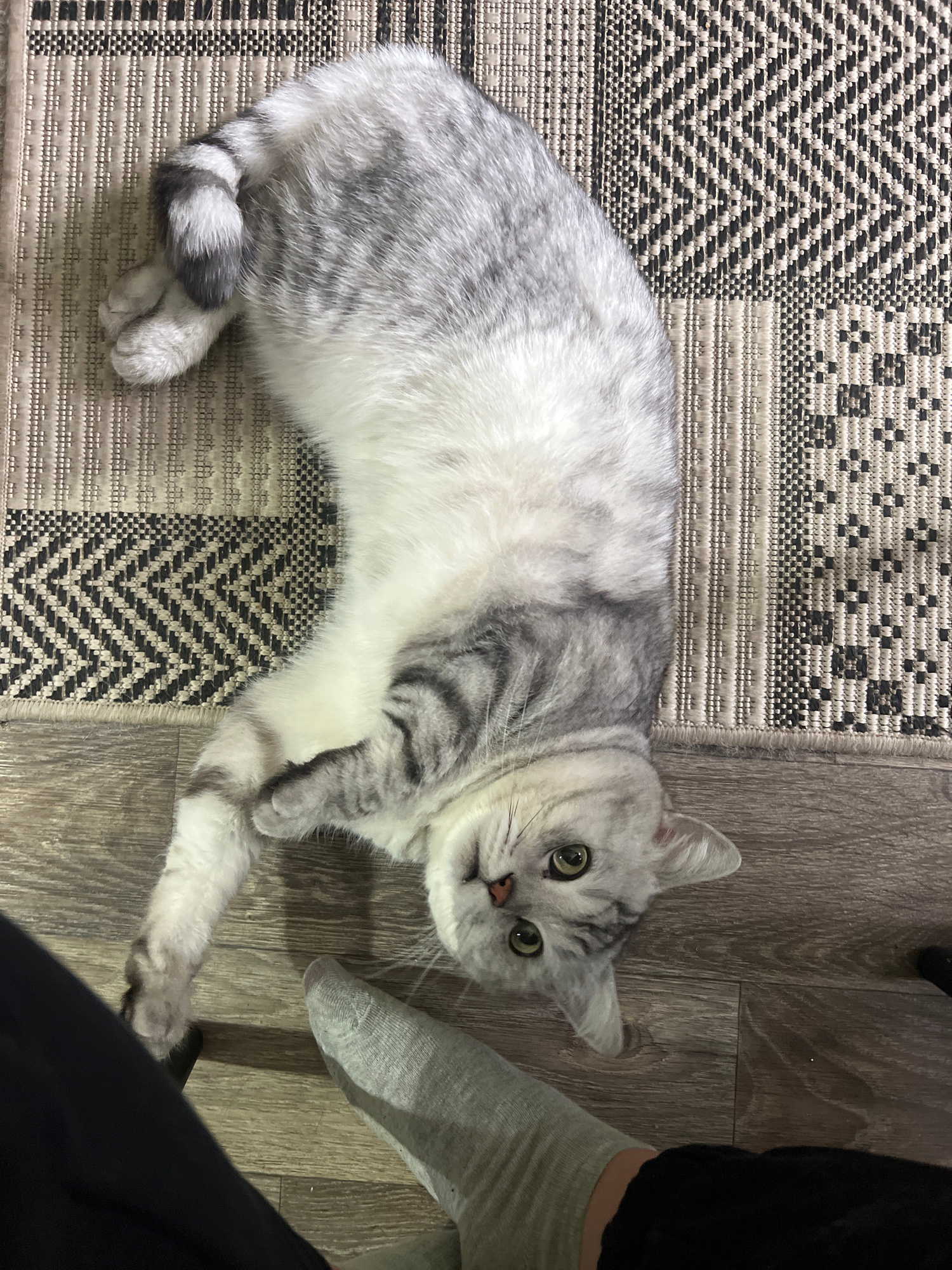 A gray and white tabby cat is lying on a textured rug partially overlaid on a wood-grain floor. The rug features a geometric pattern in black, white, and gray. The cat is lying on its side, with its s…read more