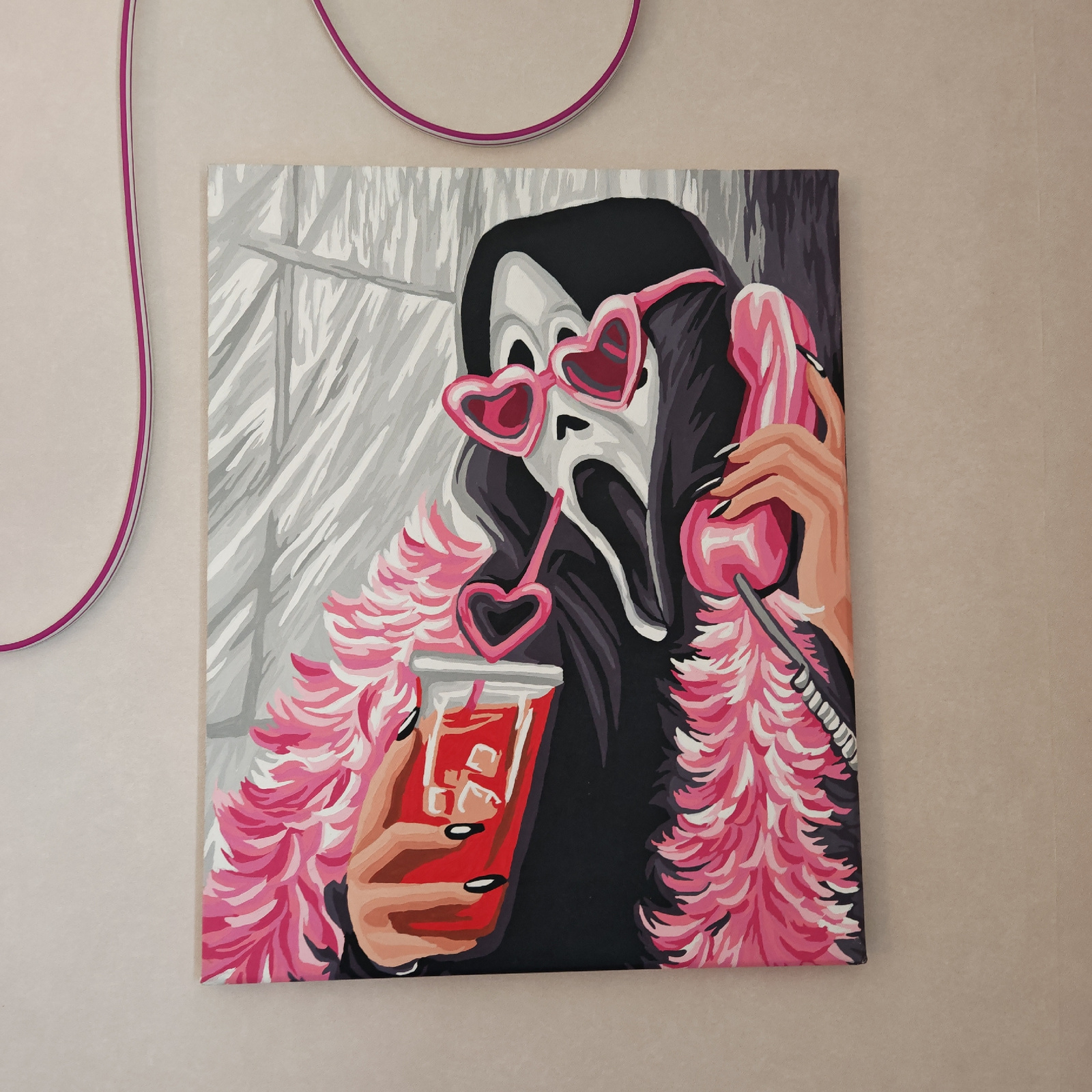 The image shows a painting hanging on a light beige wall. The painting depicts the character Ghostface from the "Scream" franchise, but with a humorous and stylish twist. Ghostface is wearing pink heaβ¦read more
