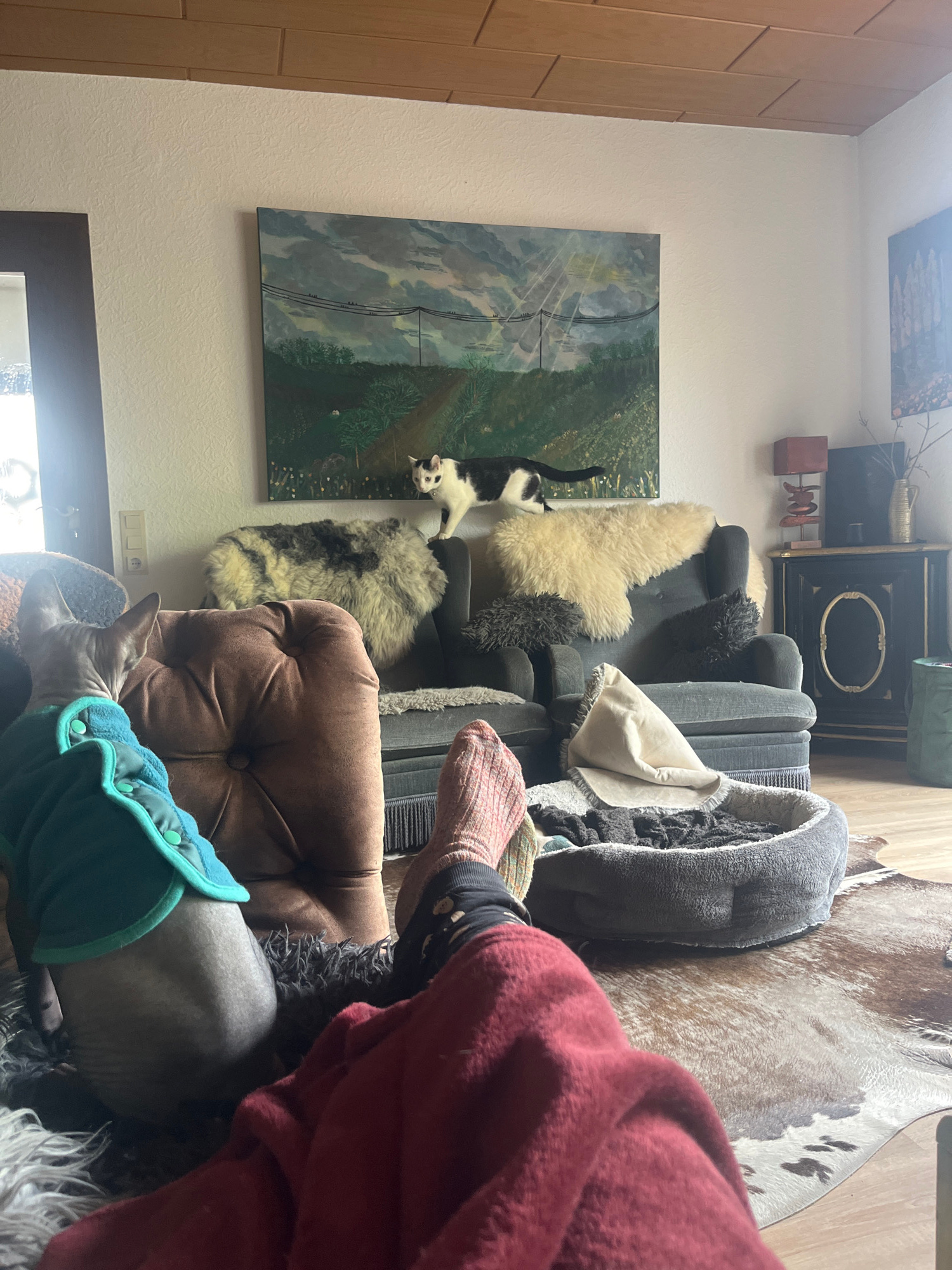 A residential interior in Konz, Germany, presents a complex arrangement of objects and subjects. A black and white cat is positioned vertically, seemingly jumping from a painting hanging on a cream-co…read more