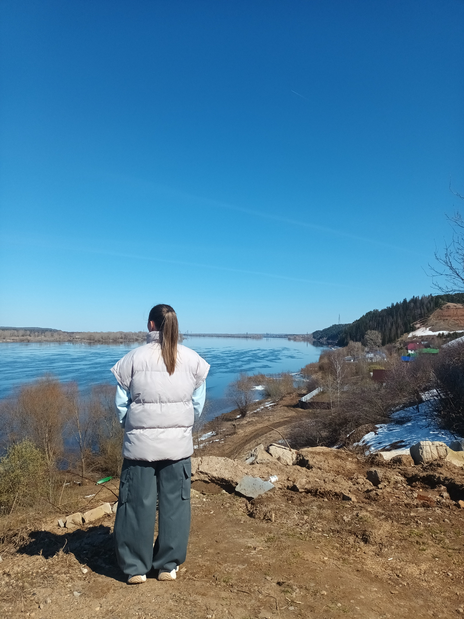 A person stands on a dirt cliff overlooking a river in Ольховка, Russia. The person wears a light-colored puffy jacket and dark pants. The river has some ice, and there are trees on the other side. Th…read more