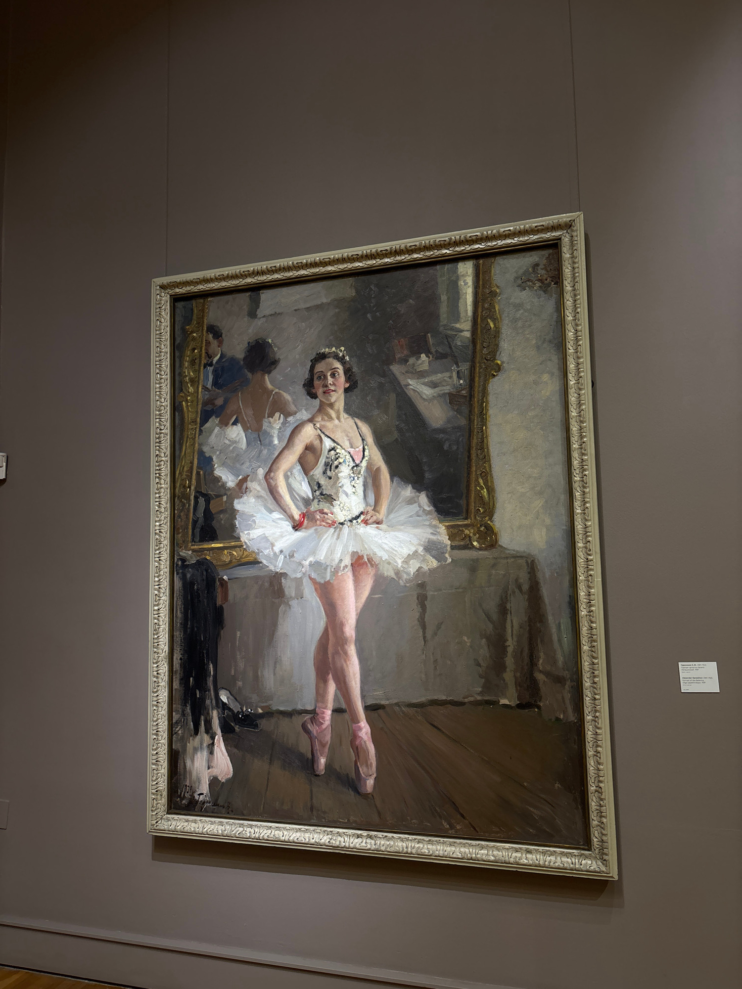 A framed painting hangs on a wall in a museum. The painting depicts a ballerina in a white tutu stretching in front of a mirror. The mirror reflects a second ballerina. The painting is of a muted colo…read more