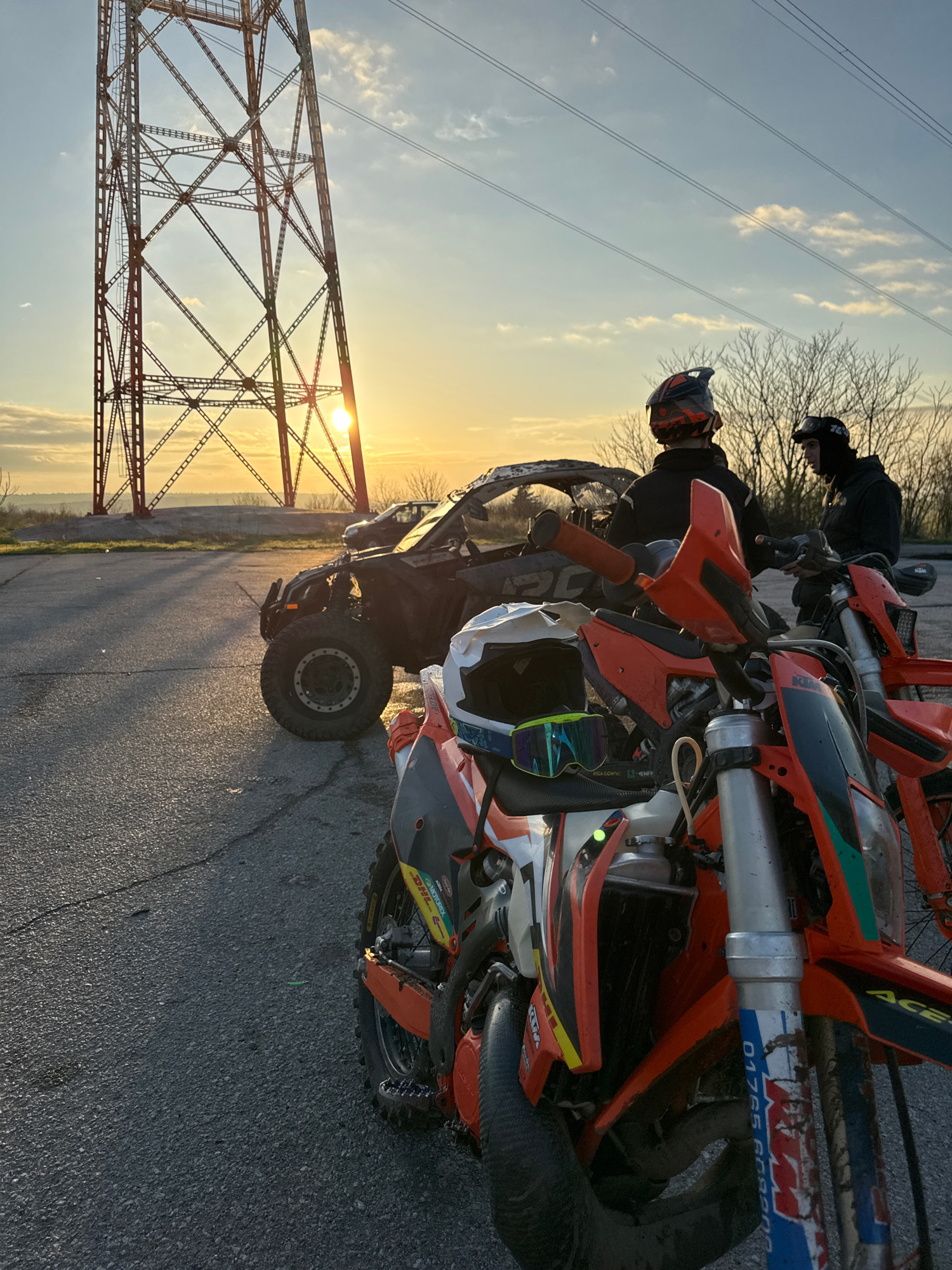The image captures a group of people with off-road vehicles and motorcycles on a paved surface near a large metal lattice pylon. The sun is setting in the background, casting a warm glow across the scene. The location is Kozloduy, Bulgaria, indicated by the "01765 KOZLODUY" marking on one of the motorcycles. Two individuals are visible, one wearing an orange and black helmet standing next to a side-by-side off-road vehicle, and another wearing a black jacket and helmet, positioned on a motorcycle behind the first person. Several motorcycles are closely parked together, primarily orange and white in color. The large metal lattice pylon and the landscape are silhouetted against the setting sun. The sky is a mix of blues and oranges. The pavement is cracked and shows signs of wear. The image is angled on its side, rotating the ground up. | Open Wire