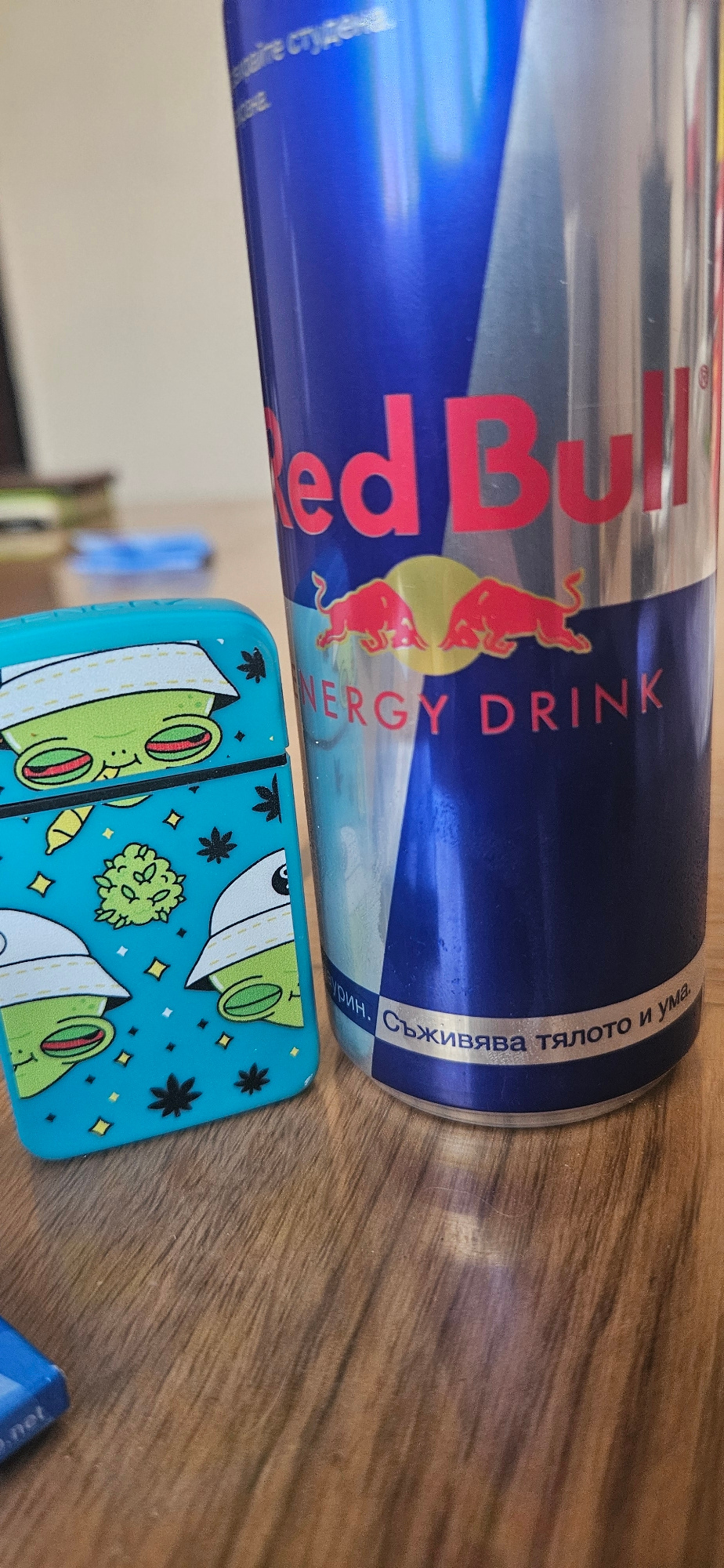 The image shows a can of Red Bull energy drink lying on its side on a wooden surface. Next to the can is a blue phone case with a cartoon frog design. The can's label is partially visible, displaying…read more