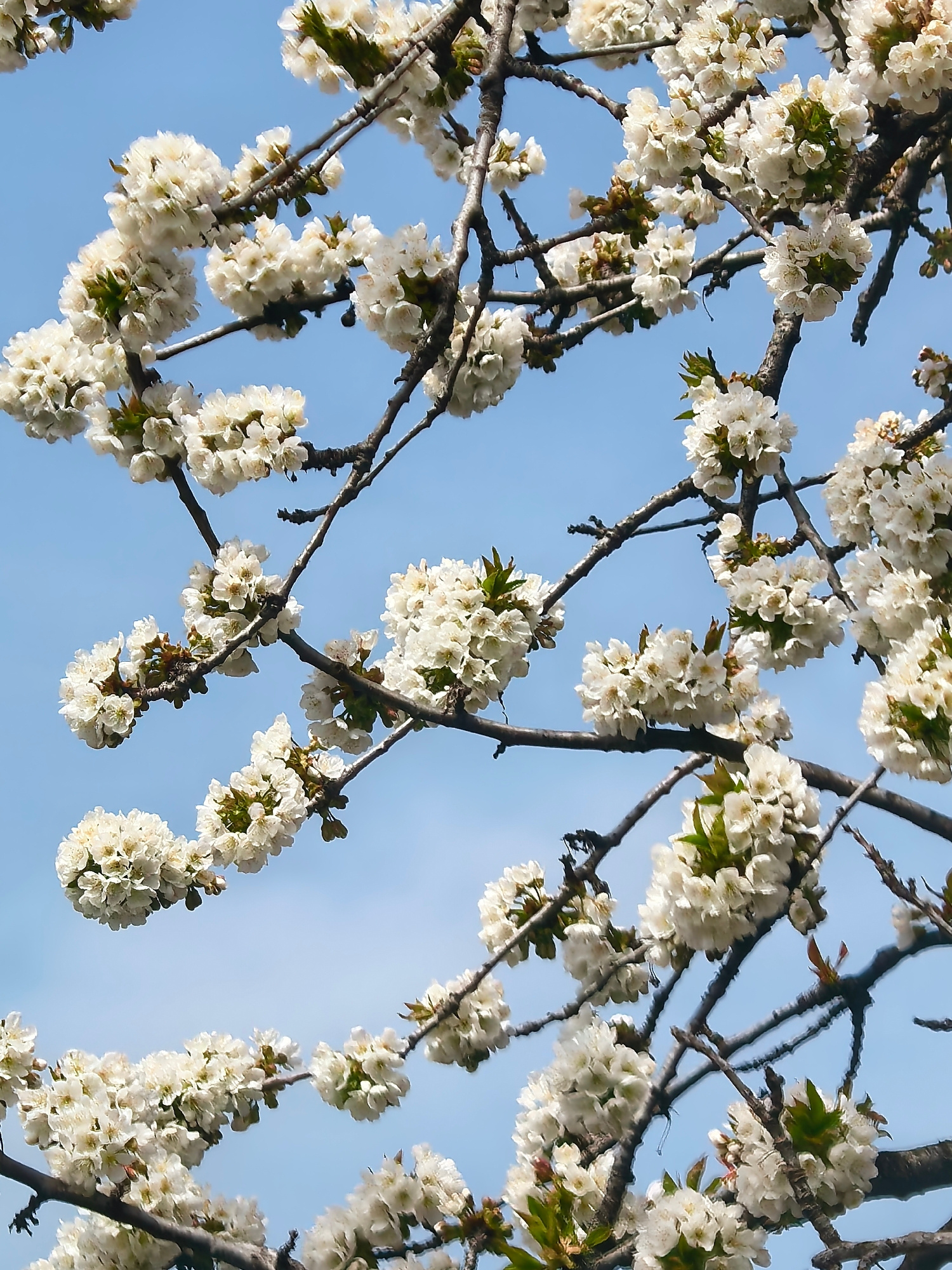 A low-angle shot captures the delicate white blossoms of a tree against a light blue sky. The branches, mostly bare, are adorned with clusters of flowers, creating a vibrant contrast. Small green leav…read more
