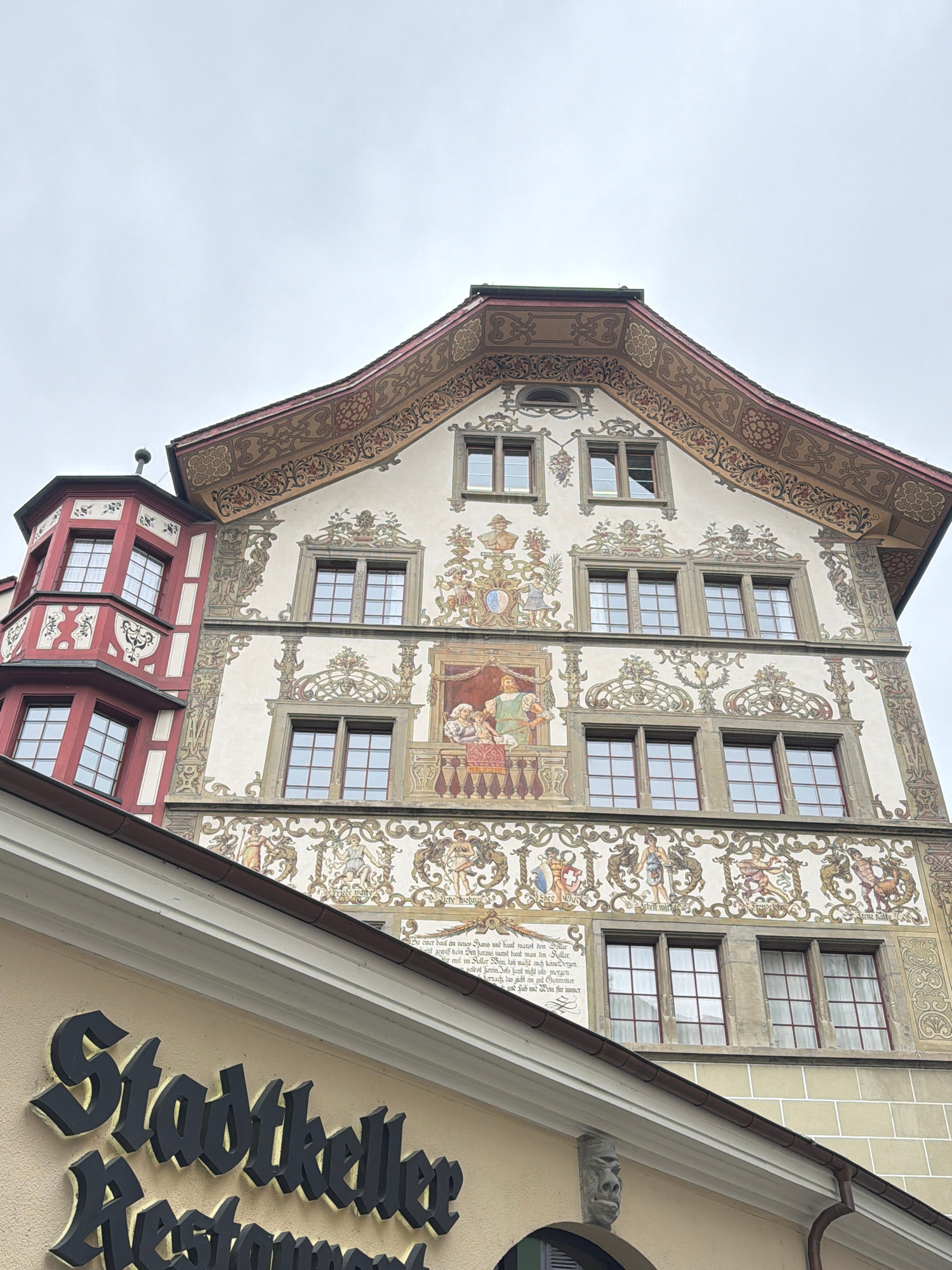 The image is a low-angle shot of a building facade in Lucerne, Switzerland. The building features a painted exterior with ornamental designs, including floral patterns, figurative scenes, and text. Th…read more