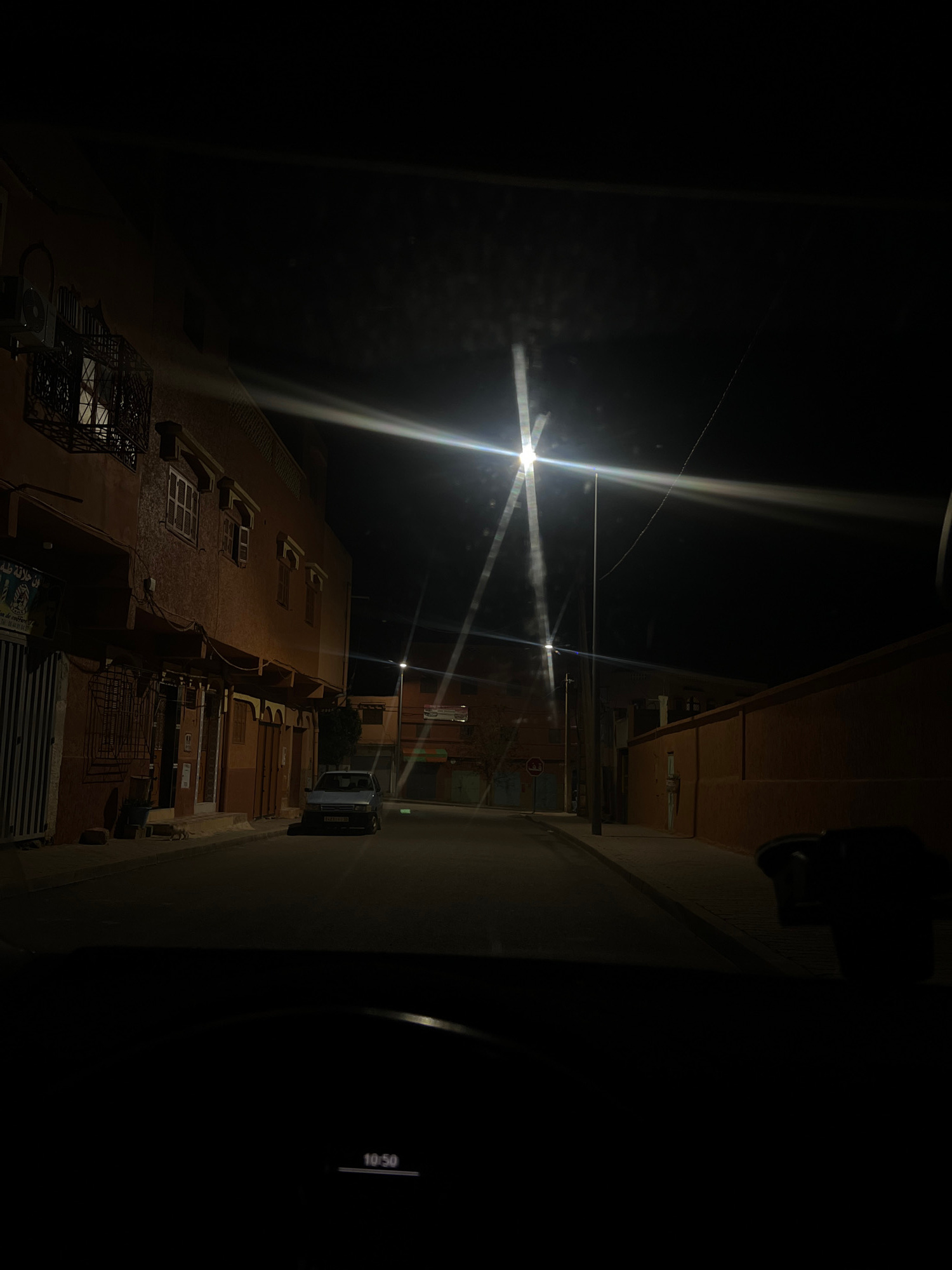 Captured at night, the image portrays a view from what appears to be a window, likely in Ouaouizert, Morocco, overlooking an urban scene. A building with reddish-brown architecture dominates the foreg…read more