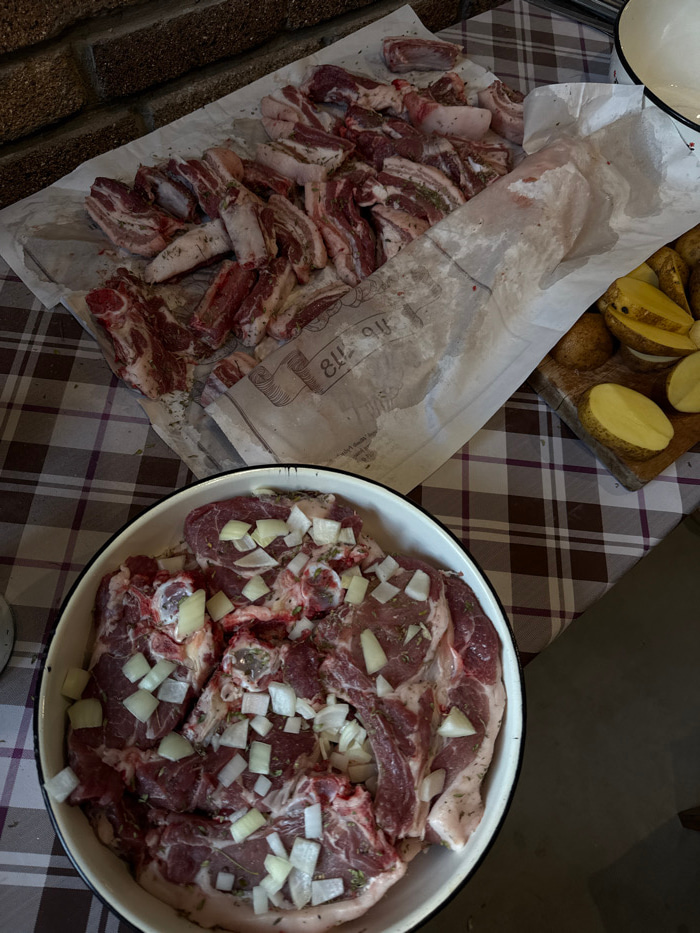 The scene depicts food preparation indoors in Dilijan, Armenia. A table, draped with a brown and white checkered tablecloth, displays raw ingredients. In the upper left, numerous raw meat cuts, appear…read more