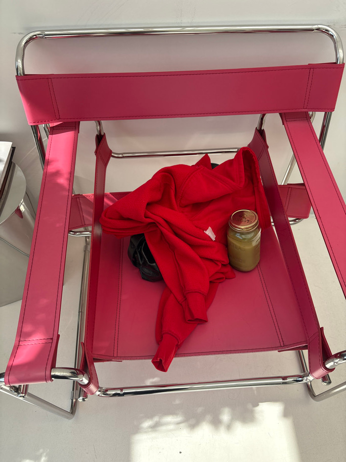 A red and pink chair has a jar, red jacket, and black shoes on the seat. The frame is metal with a hot pink material making up the back and seat. The jacket is bunched up with a portion of the shoes pā¦read more