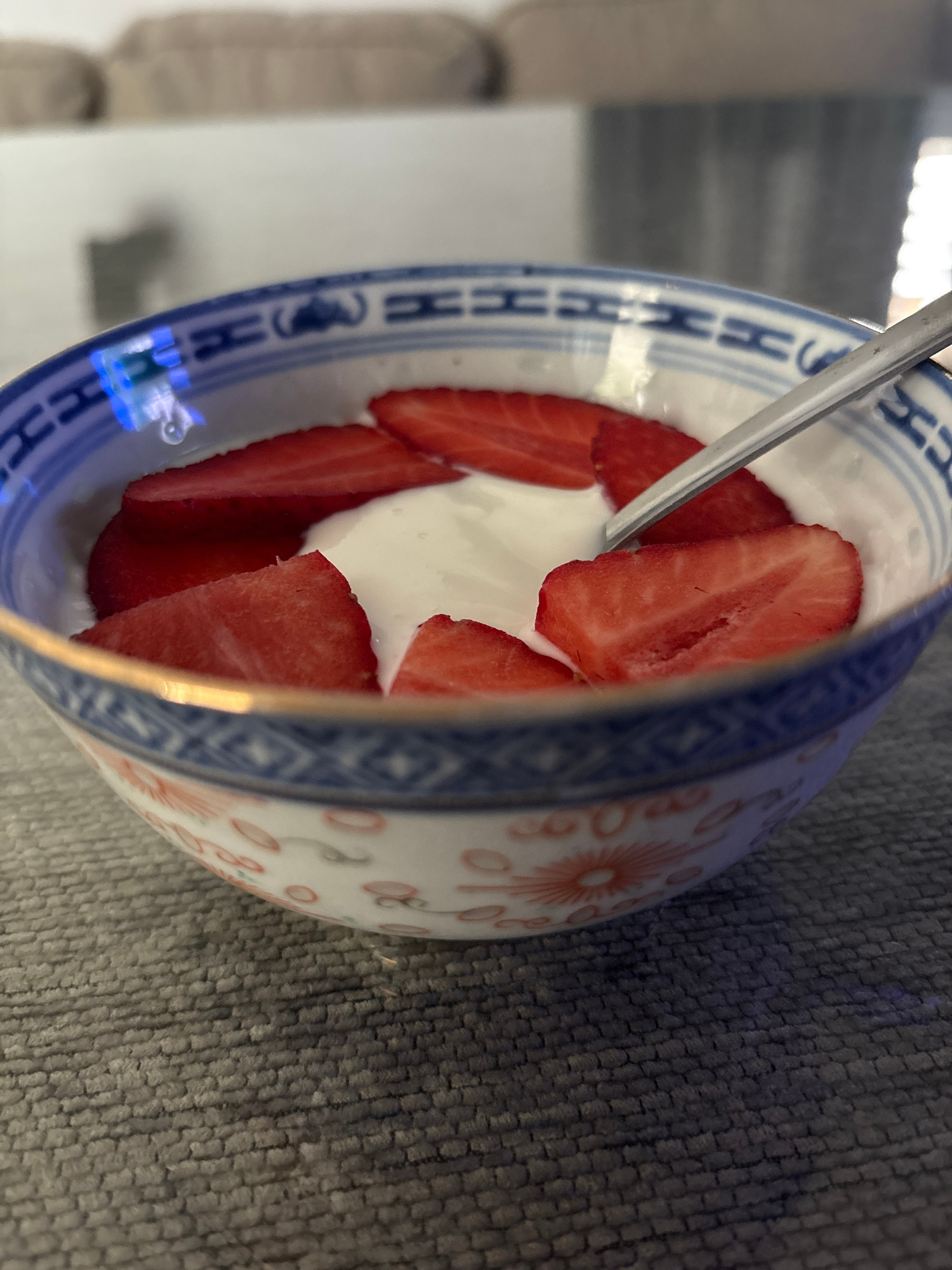 A close-up, slightly rotated image depicts a porcelain bowl containing yogurt and sliced strawberries. A spoon is partially visible within the bowl. The bowl features a traditional blue and white desi…read more