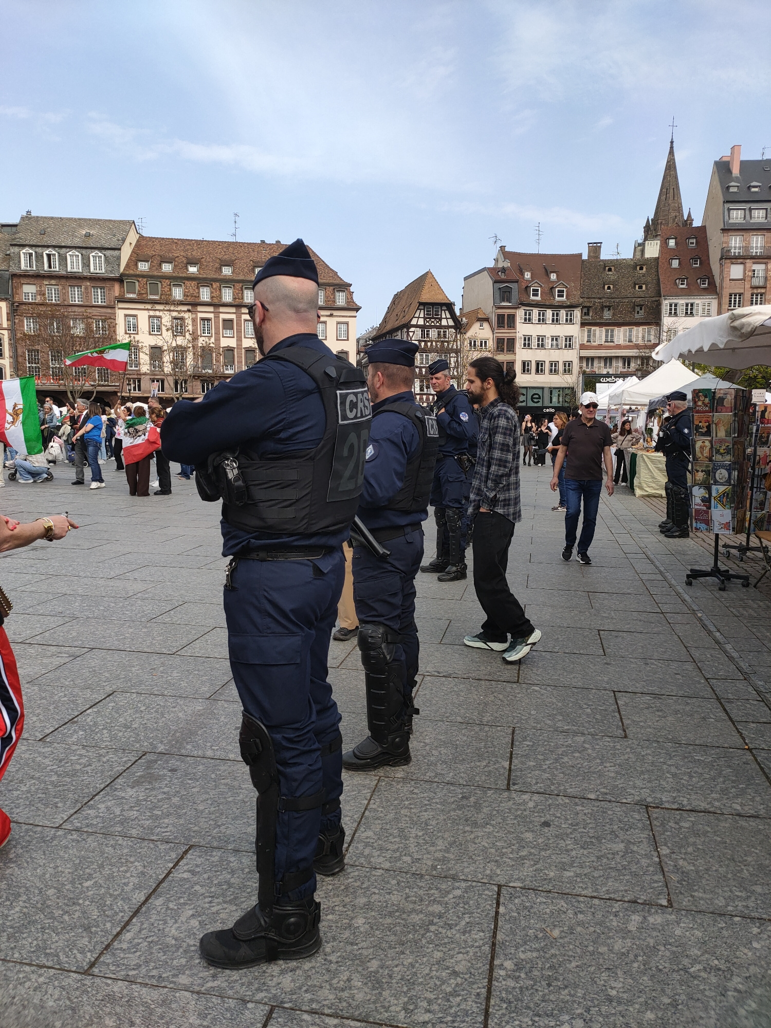 The image captures a scene in Strasbourg, France, likely in a central square. Several French police officers, wearing dark blue uniforms, vests with "CRS" printed on the back, and protective gear on t…read more