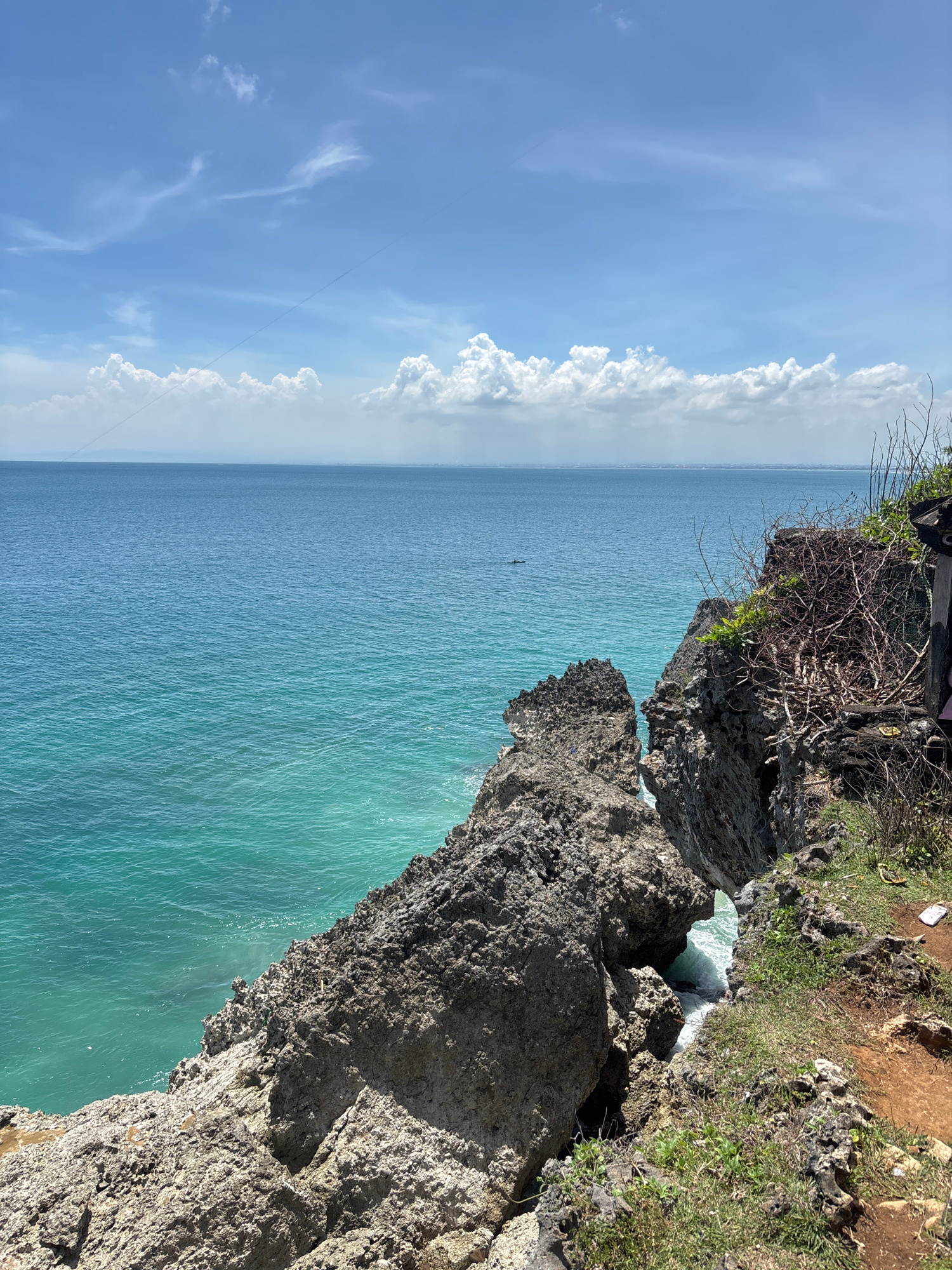 The image shows a coastal scene in Unknown, Indonesia, featuring a rugged, rocky cliff edge overlooking a turquoise ocean. Patches of green vegetation and brown soil are visible on the cliff. The ocea…read more